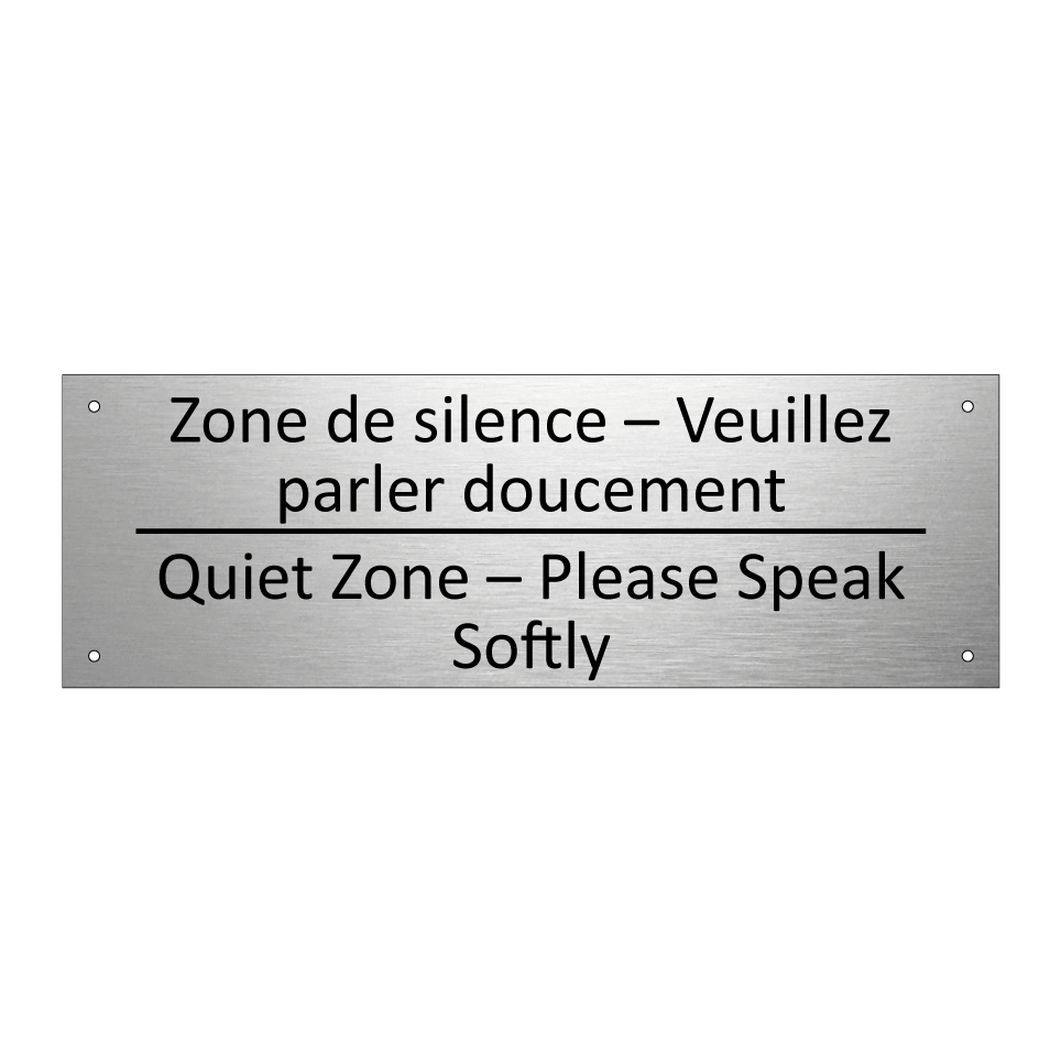 Panneau d'information avec le texte Zone de silence – Veuillez parler doucement|Quiet Zone – Please Speak Softly en français et en anglais.