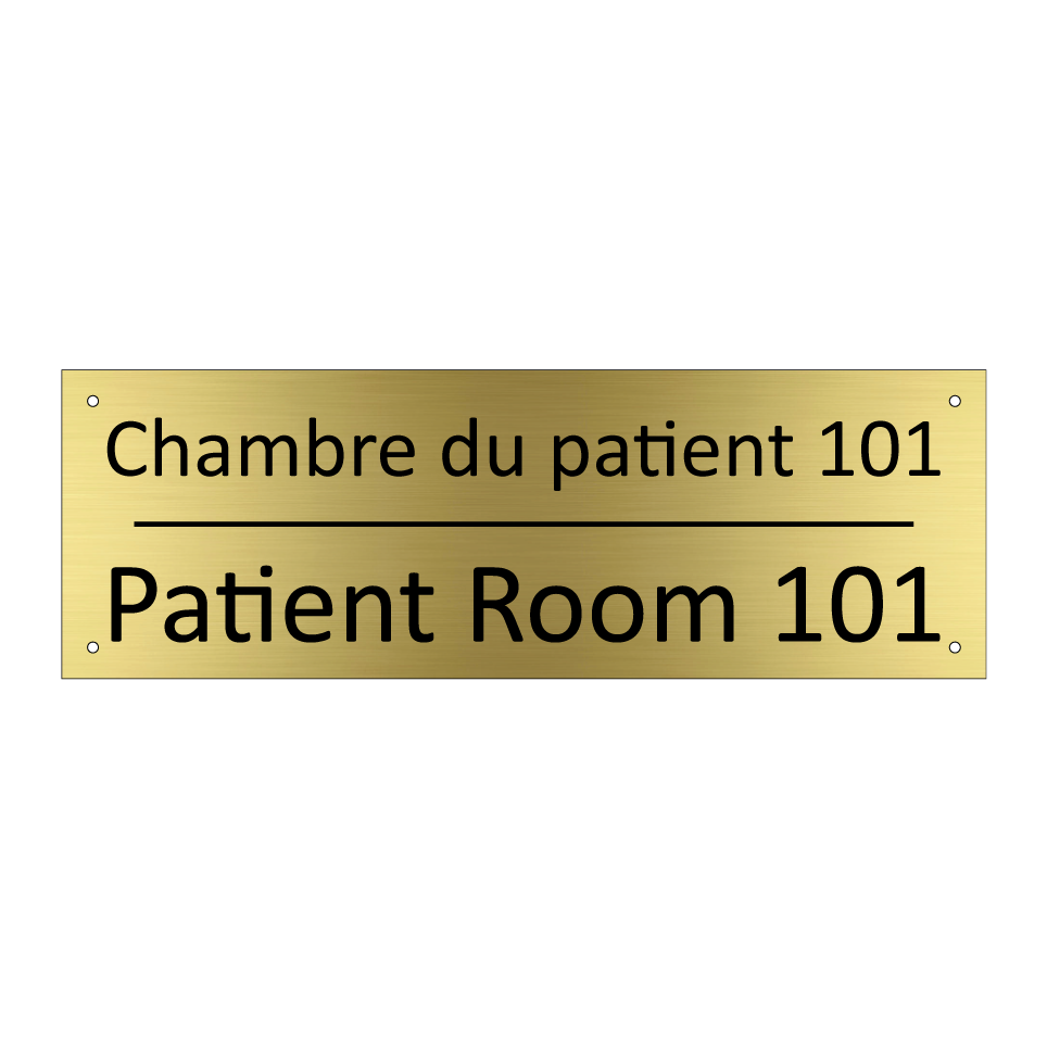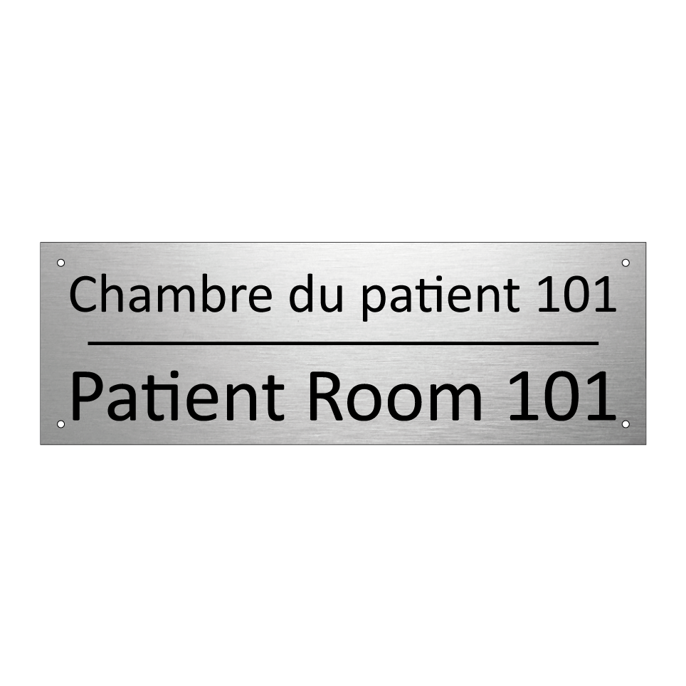 Panneau d'information avec le texte Chambre du patient 101|Patient Room 101 en français et en anglais.