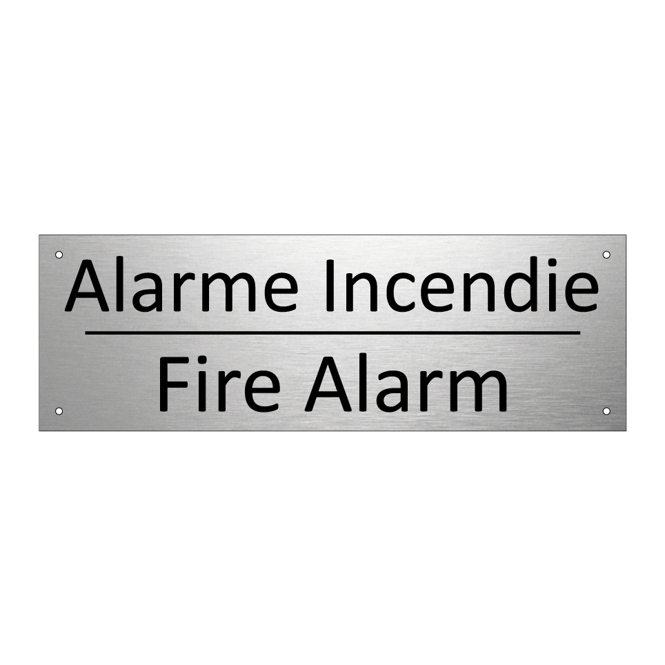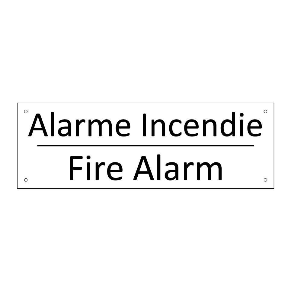 Panneau d'information avec le texte Alarme Incendie|Fire Alarm en français et en anglais.