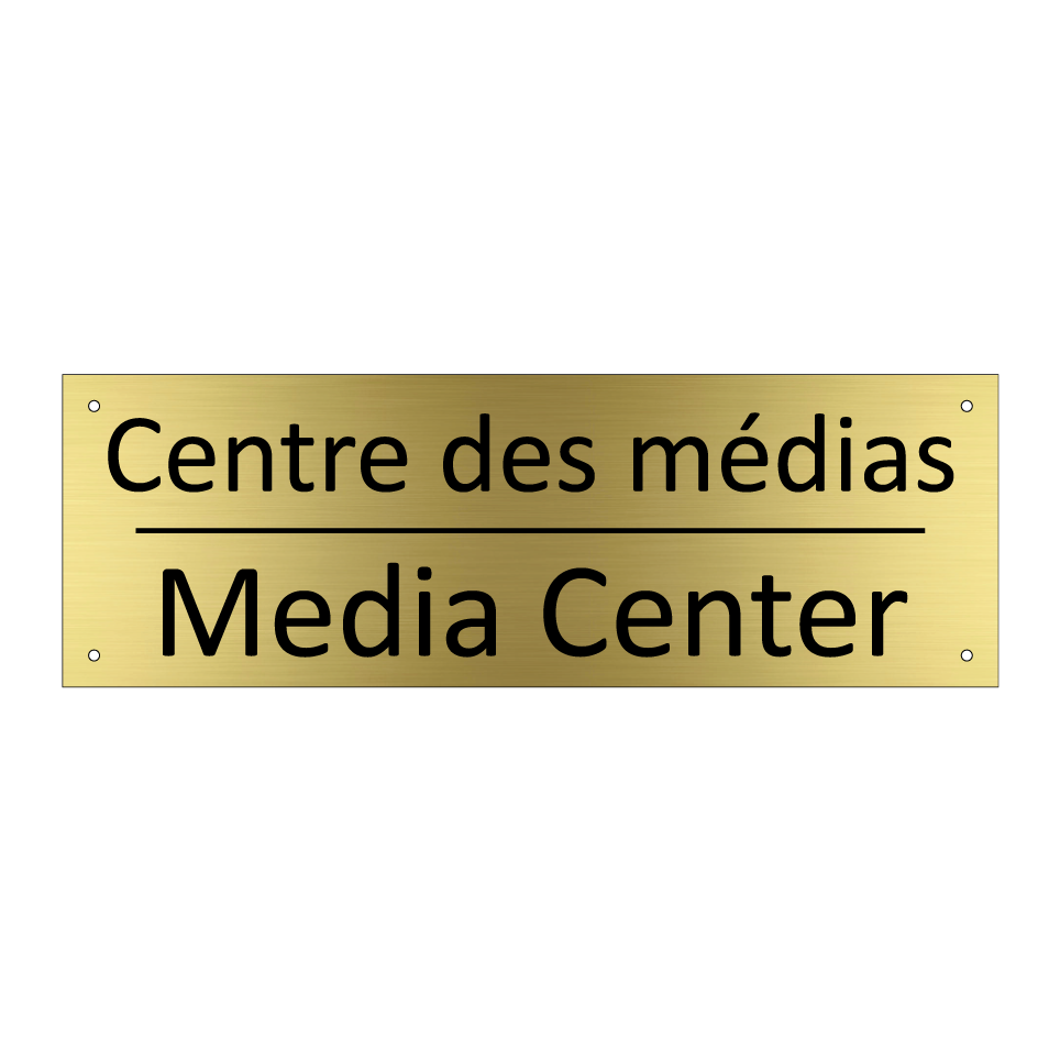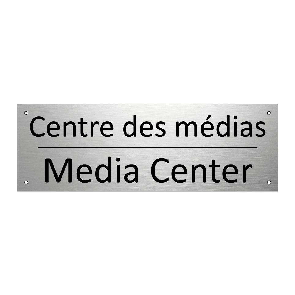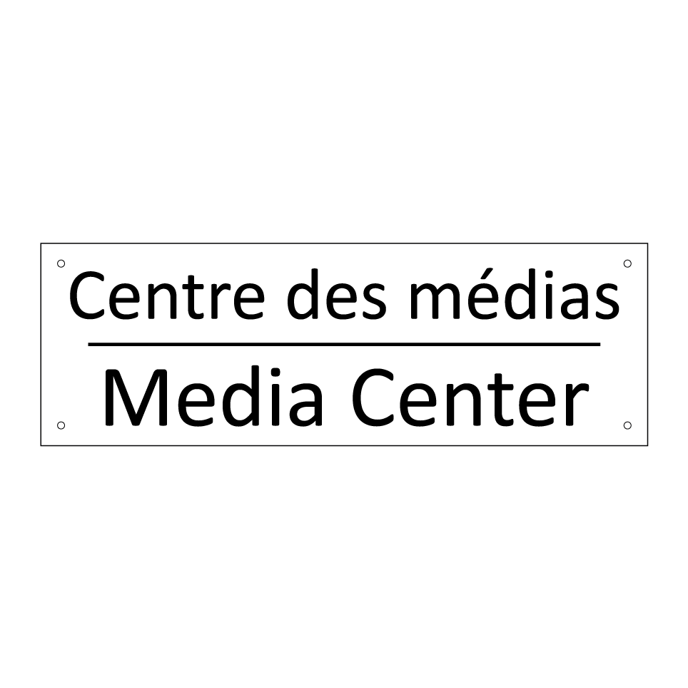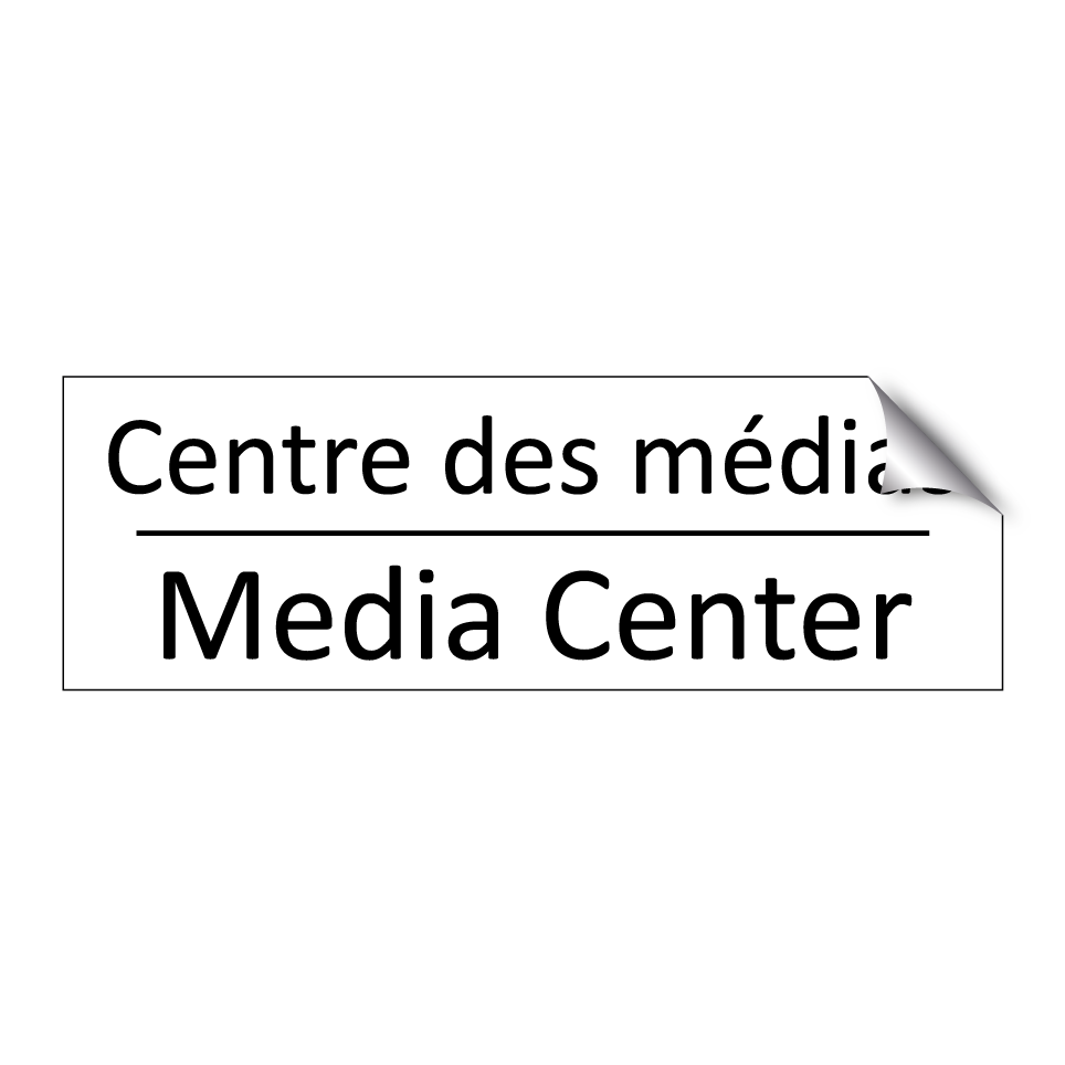 Panneau d'information avec le texte Centre des médias|Media Center en français et en anglais.