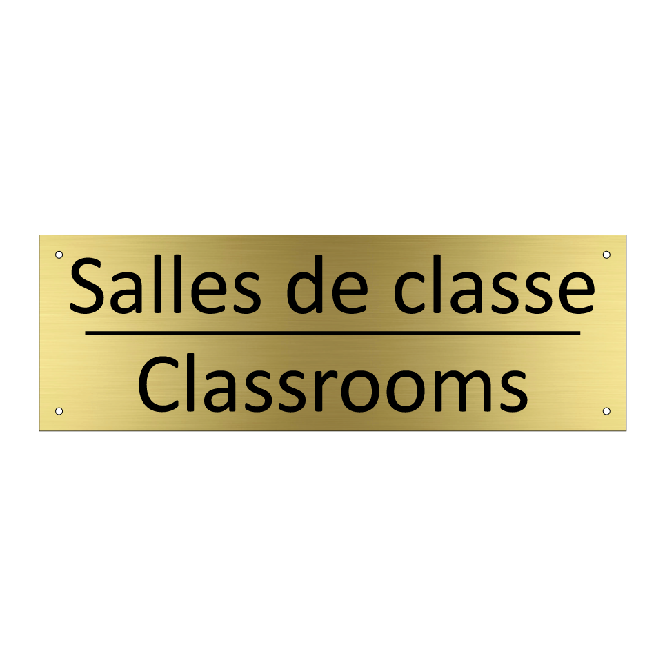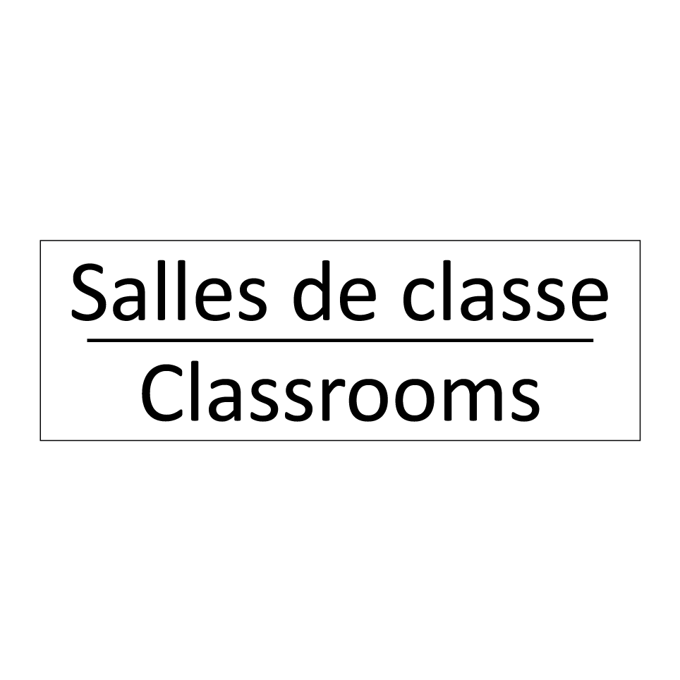 Panneau d'information avec le texte Salles de classe|Classrooms en français et en anglais.