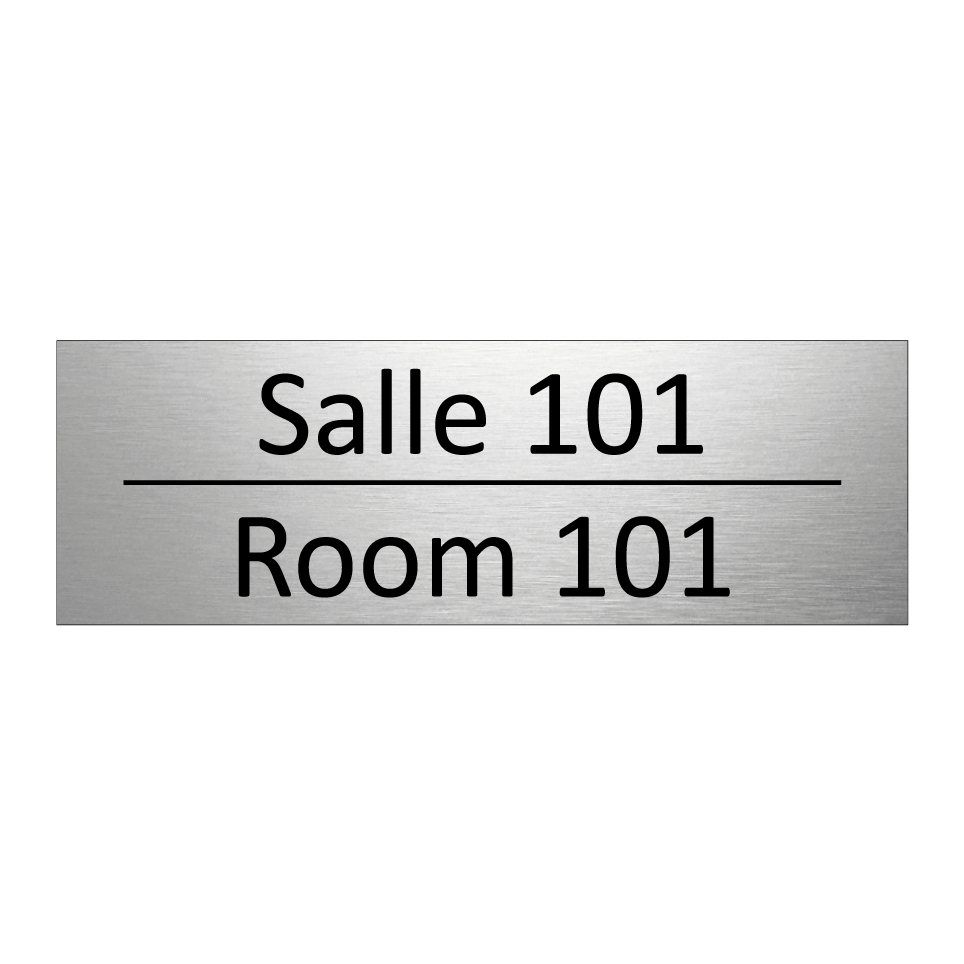 Panneau d'information avec le texte Salle 101|Room 101 en français et en anglais.