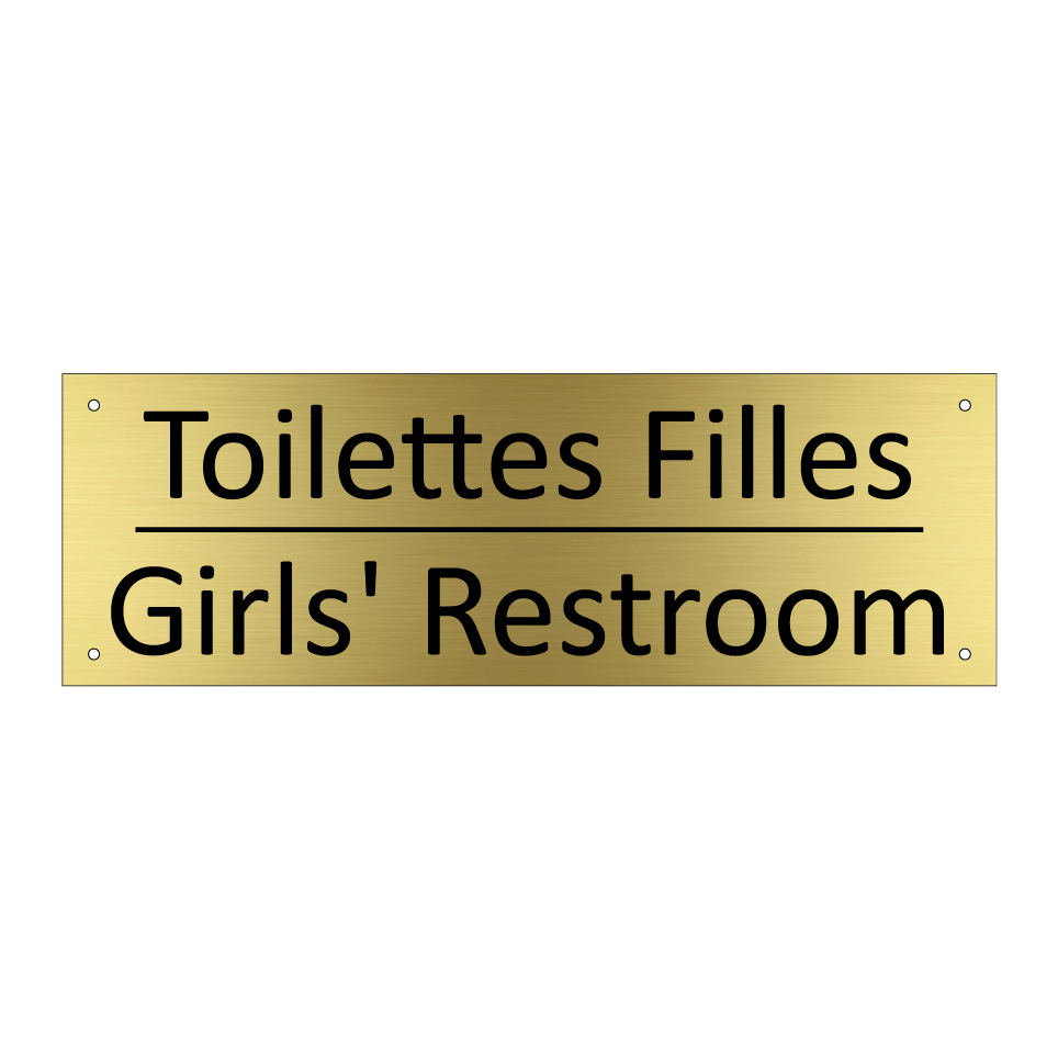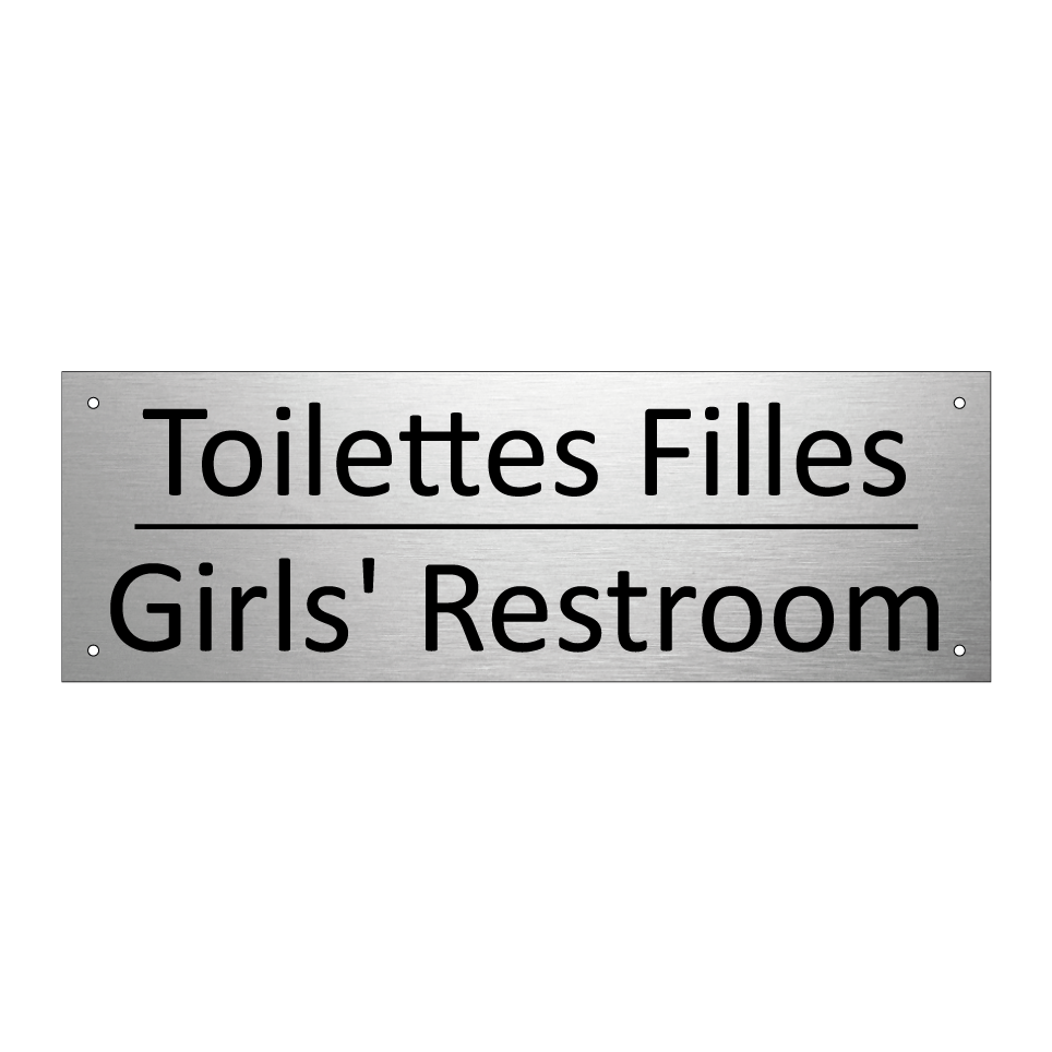 Panneau d'information avec le texte Toilettes Filles|Girls' Restroom en français et en anglais.