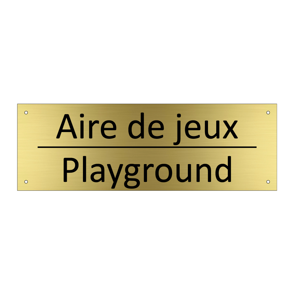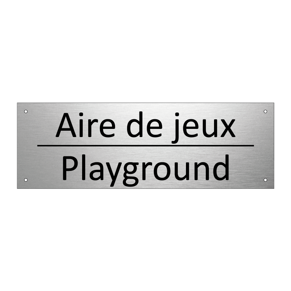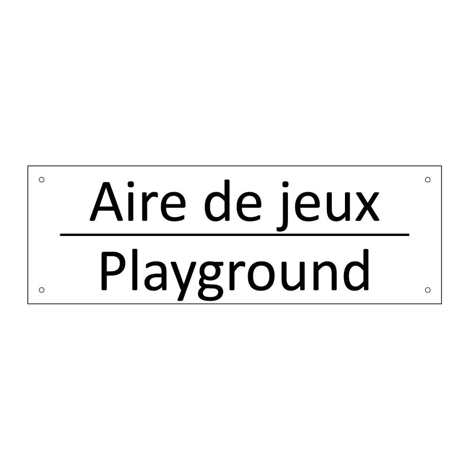 Panneau d'information avec le texte Aire de jeux|Playground en français et en anglais.