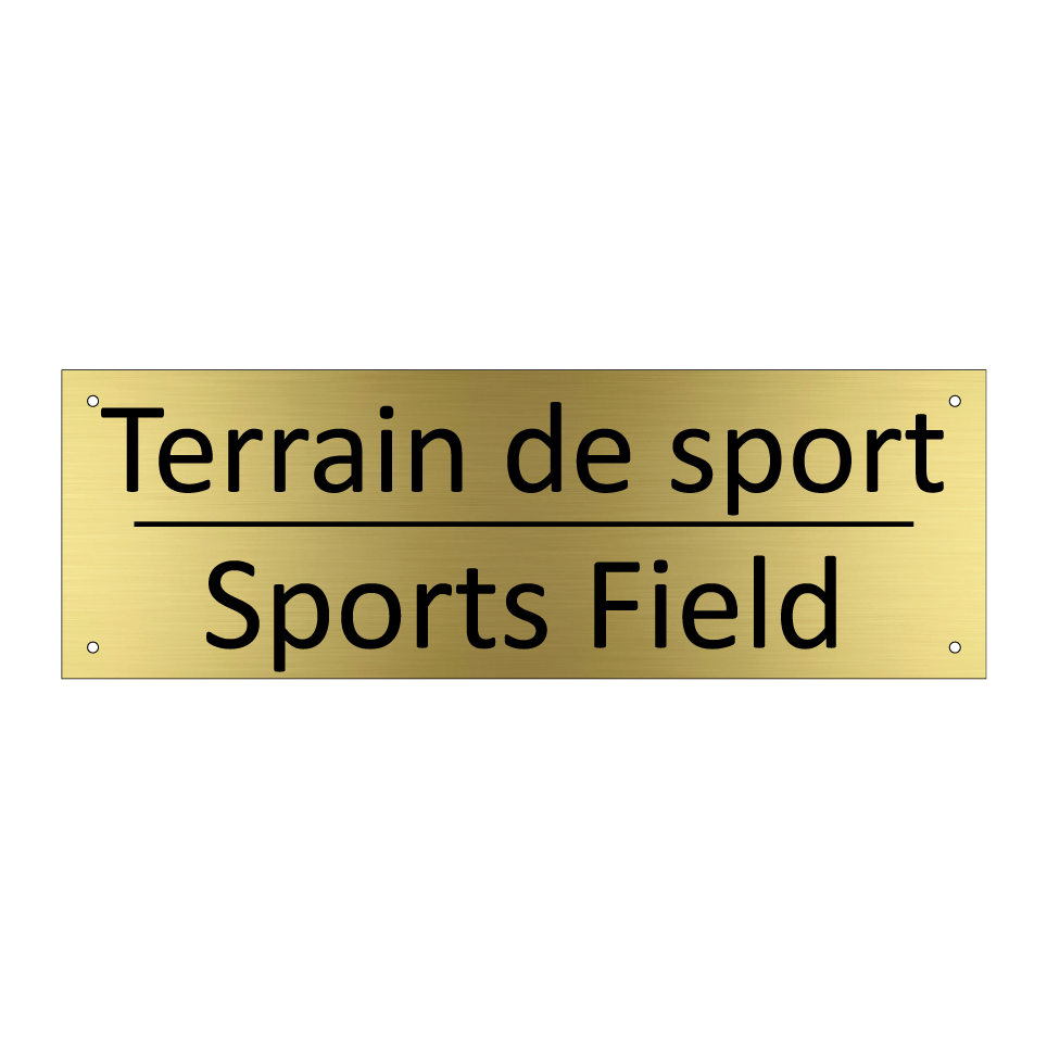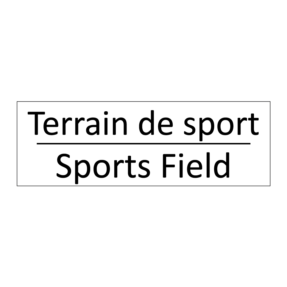 Panneau d'information avec le texte Terrain de sport|Sports Field en français et en anglais.