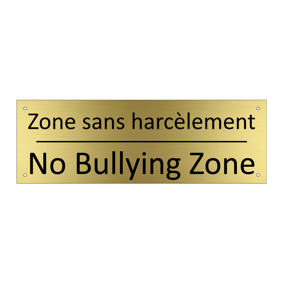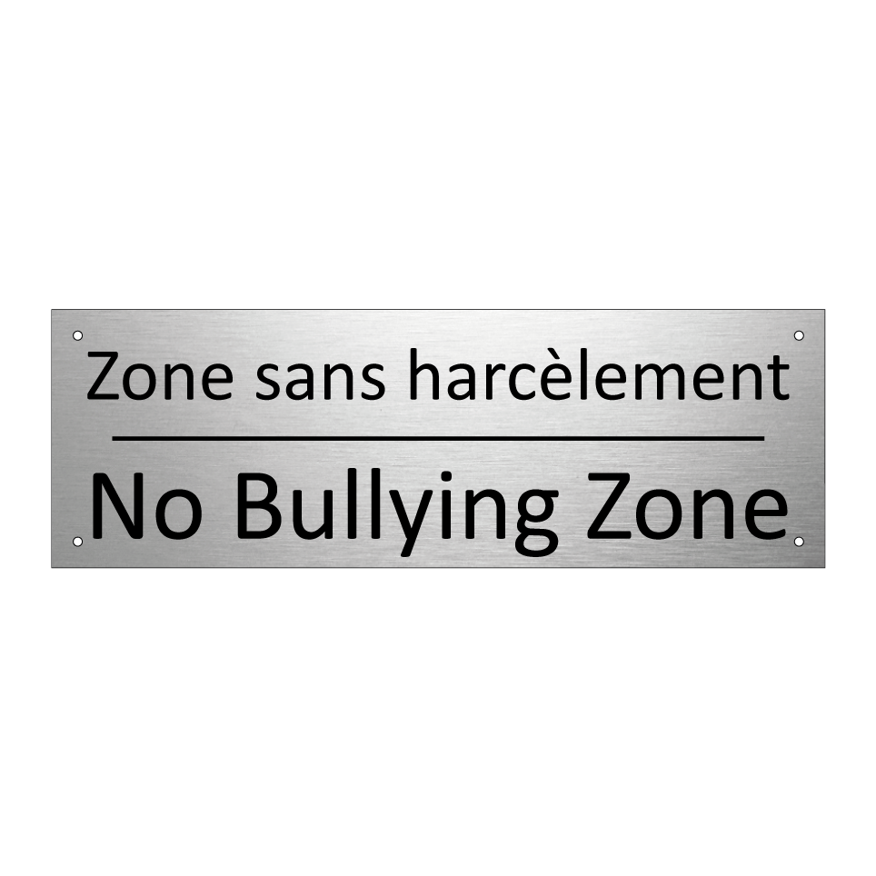 Panneau d'information avec le texte Zone sans harcèlement|No Bullying Zone en français et en anglais.