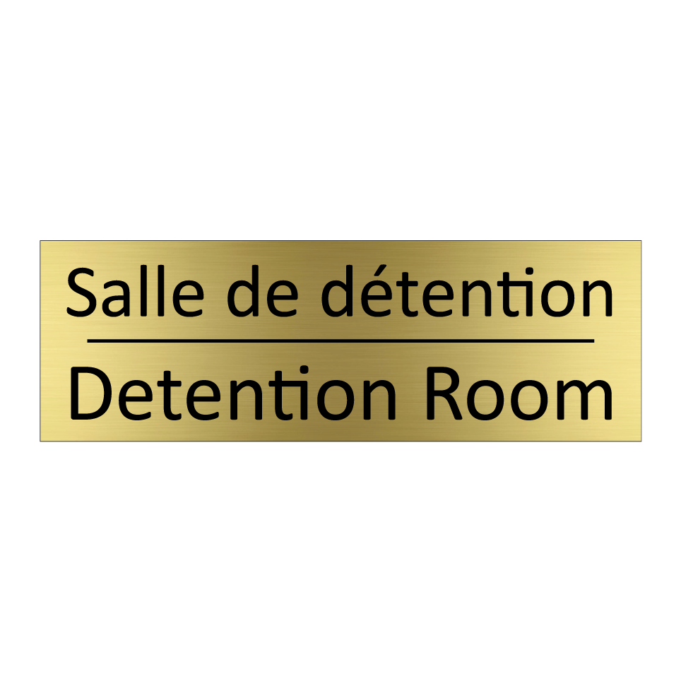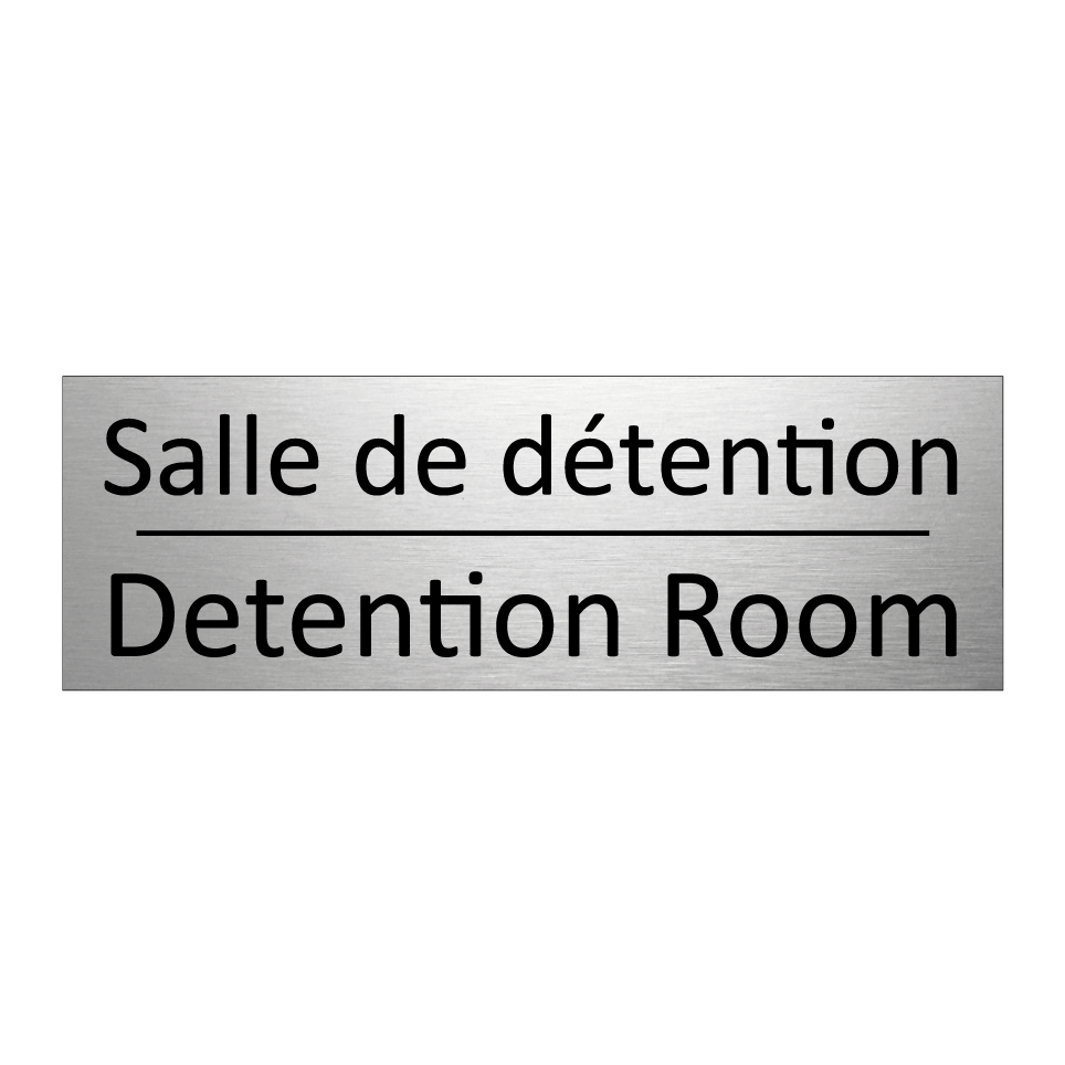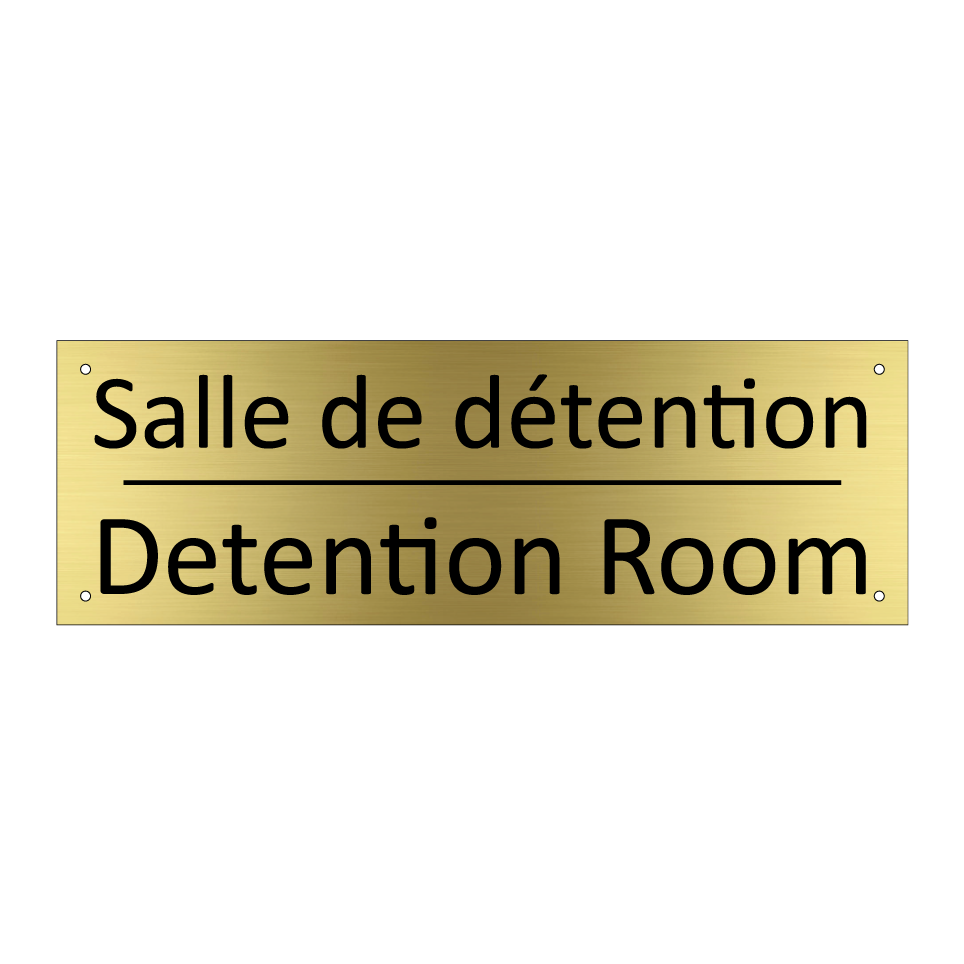Panneau d'information avec le texte Salle de détention|Detention Room en français et en anglais.