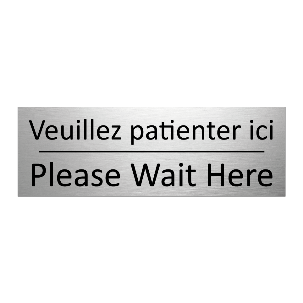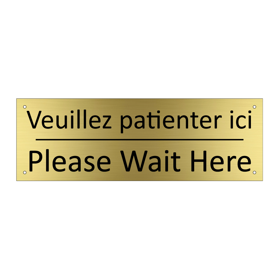 Panneau d'information avec le texte Veuillez patienter ici|Please Wait Here en français et en anglais.