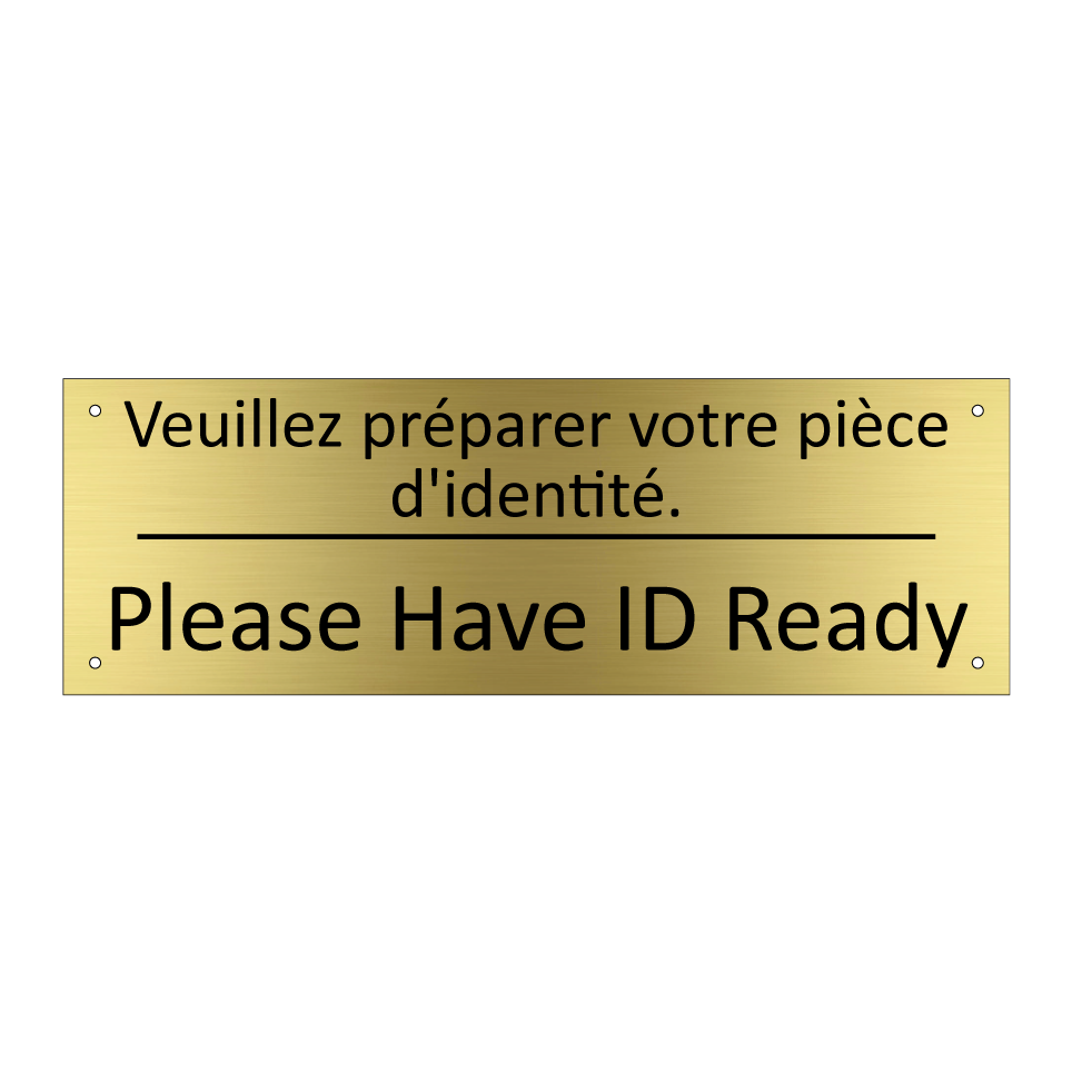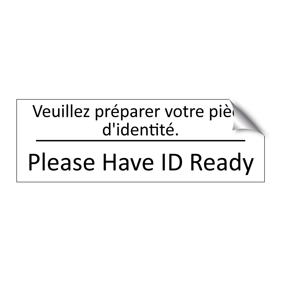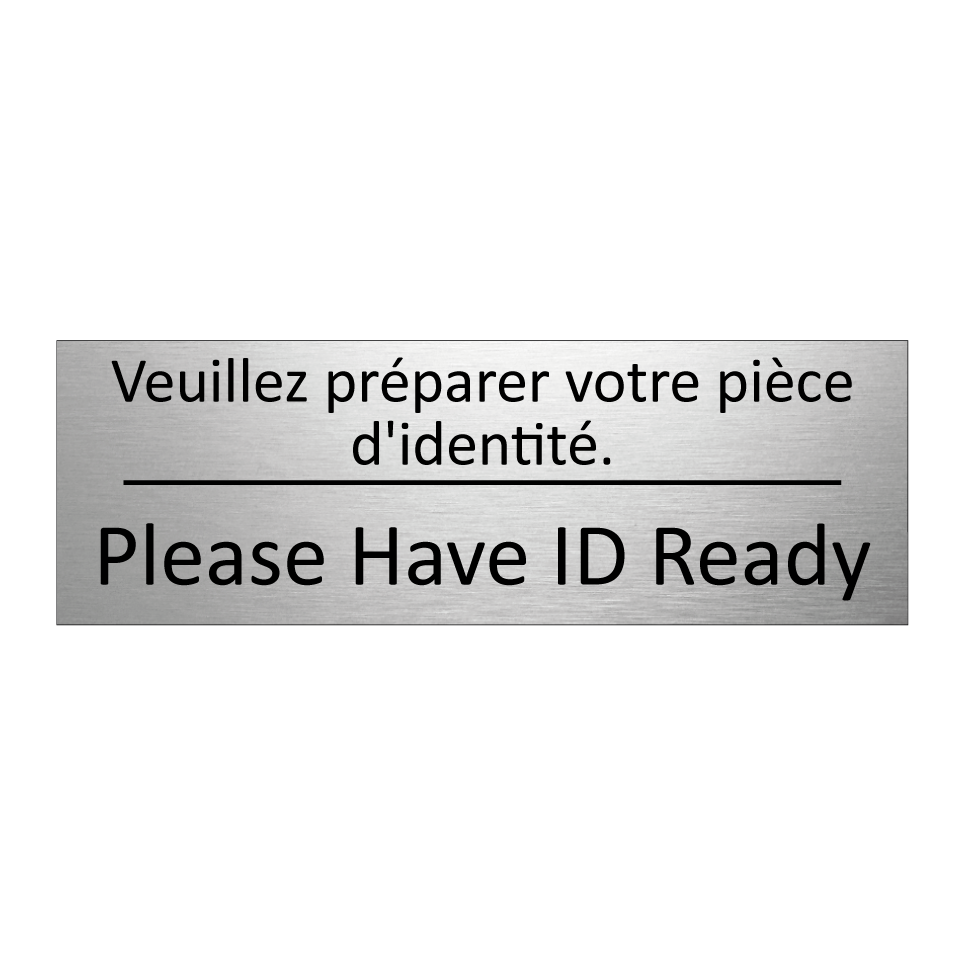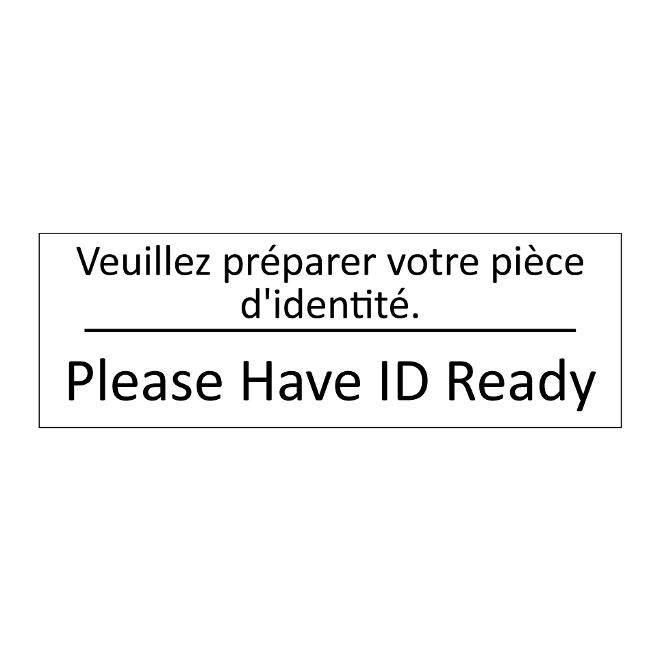 Panneau d'information avec le texte Veuillez préparer votre pièce d'identité.|Please Have ID Ready en français et en anglais.