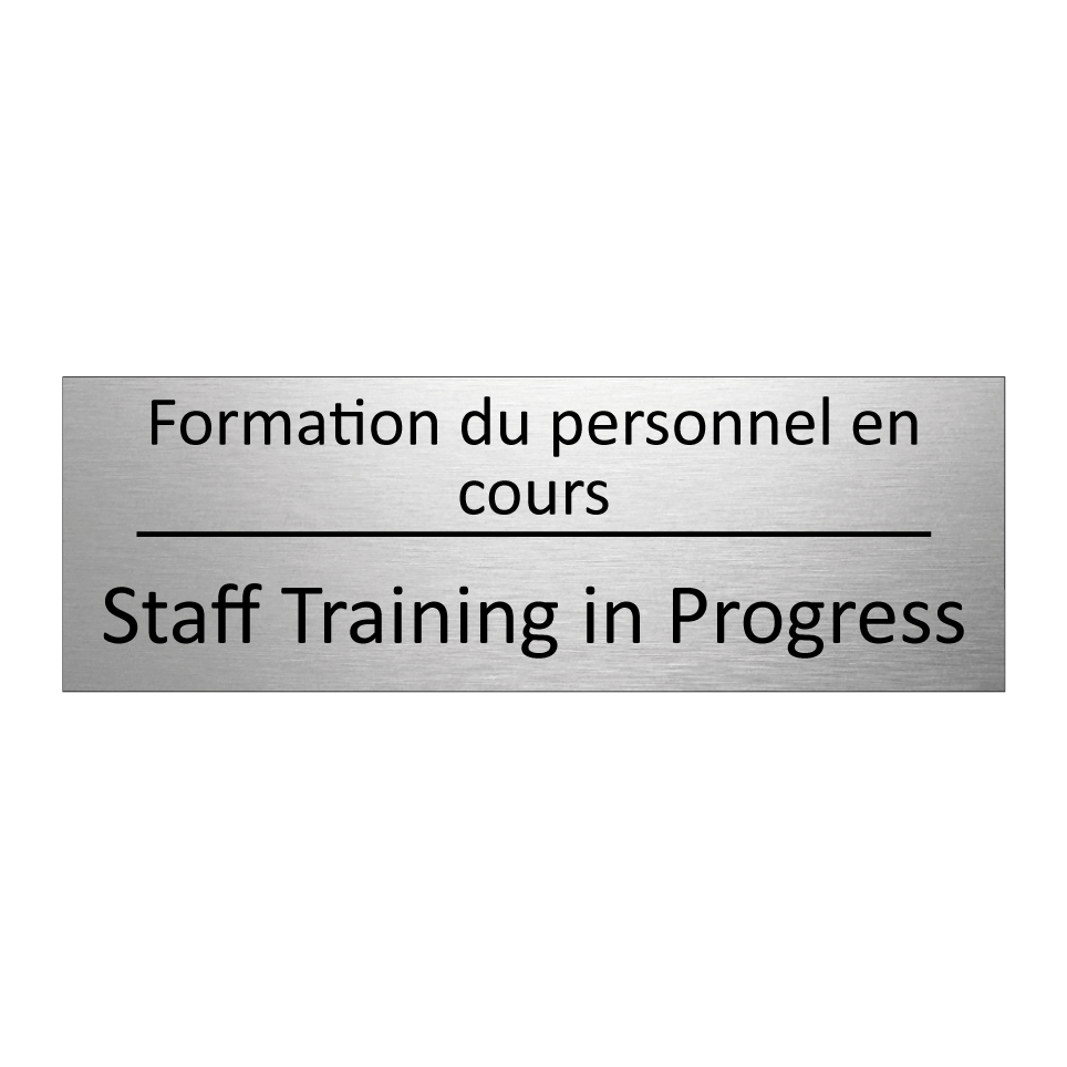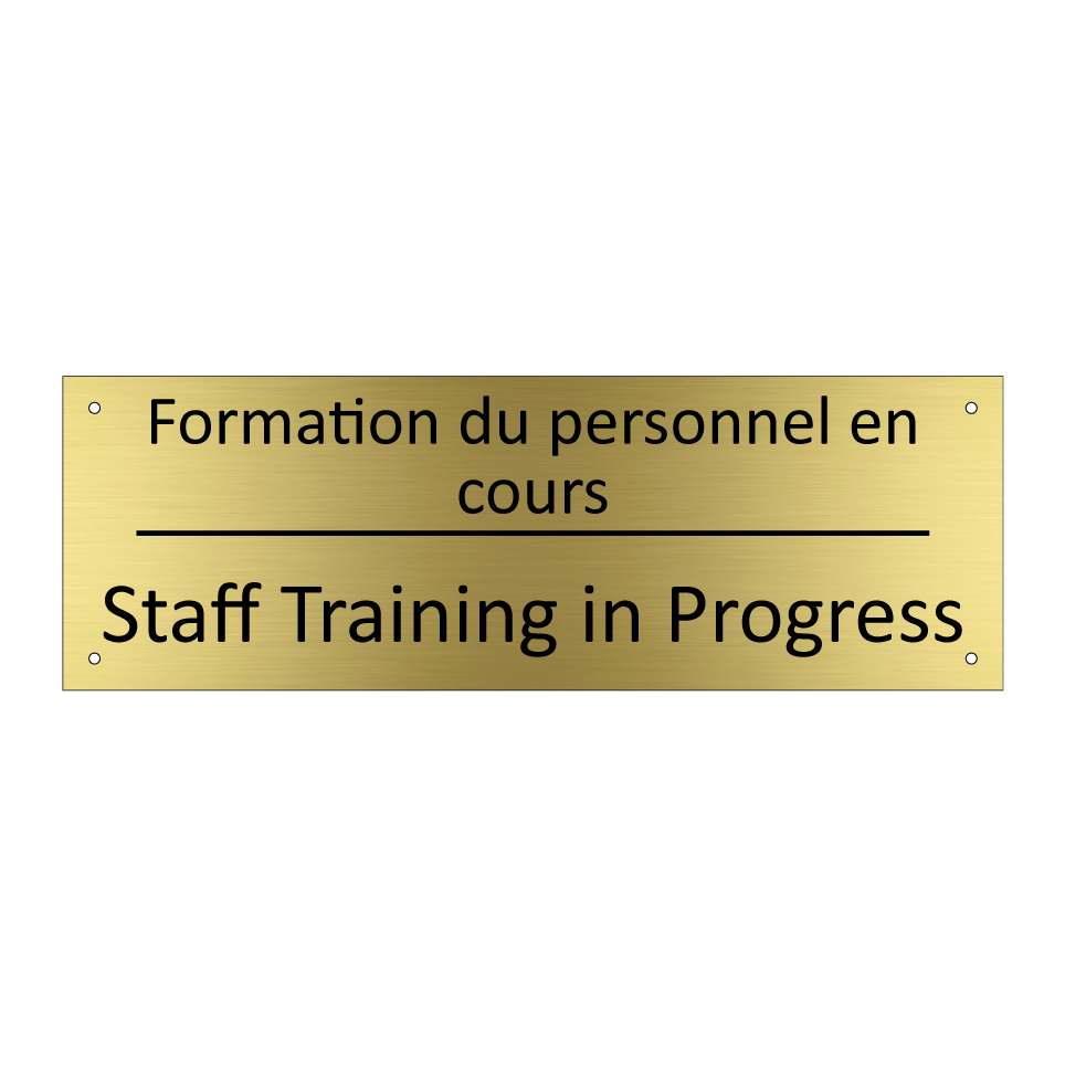 Panneau d'information avec le texte Formation du personnel en cours|Staff Training in Progress en français et en anglais.