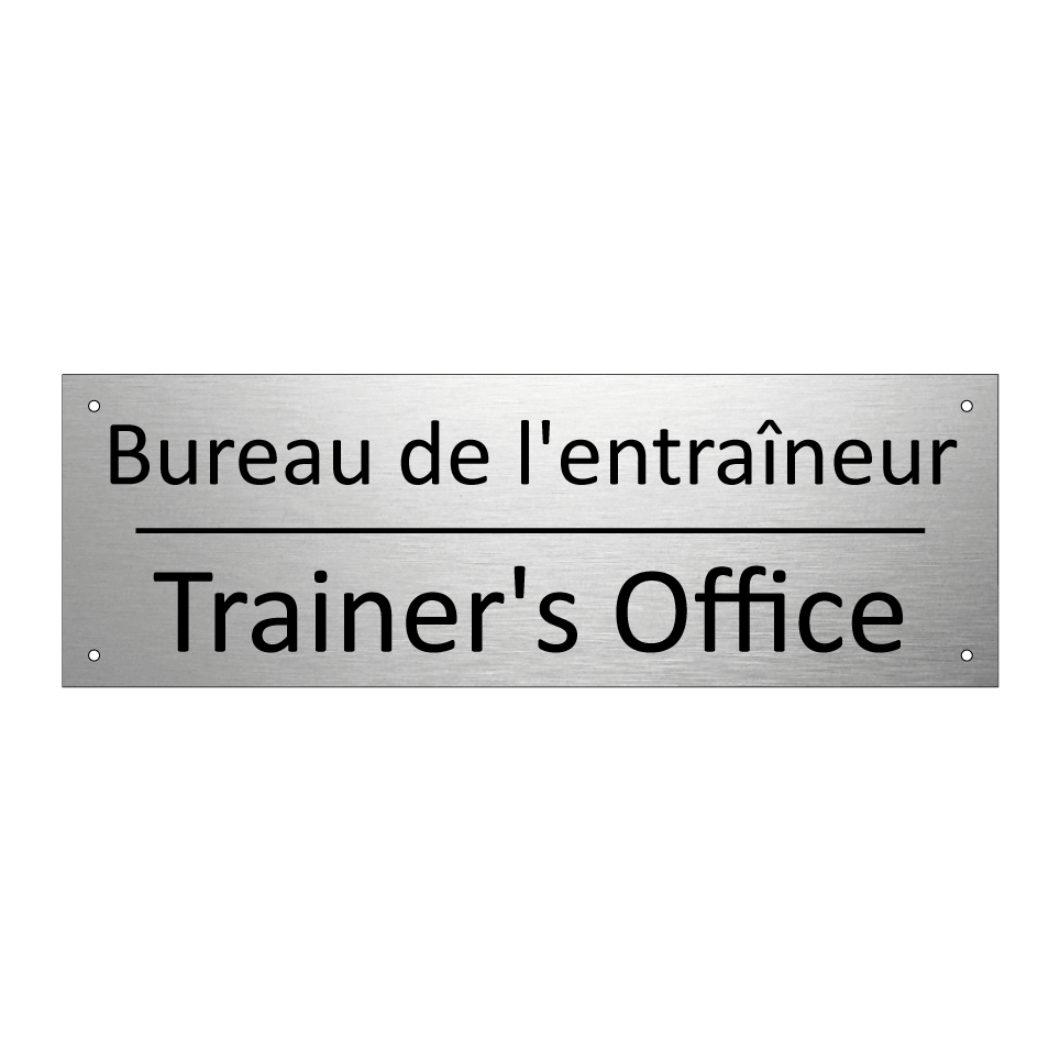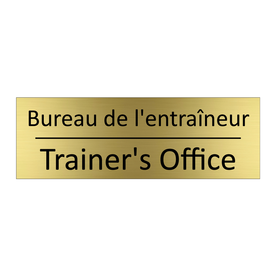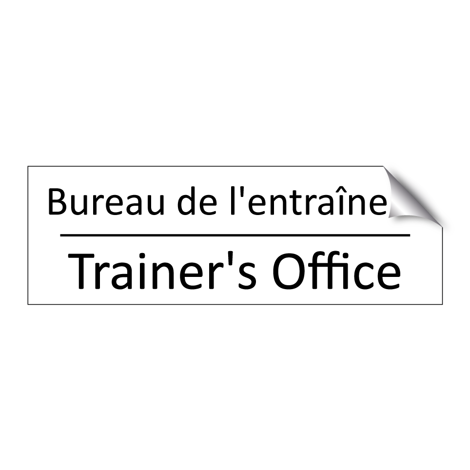 Panneau d'information avec le texte Bureau de l'entraîneur|Trainer's Office en français et en anglais.