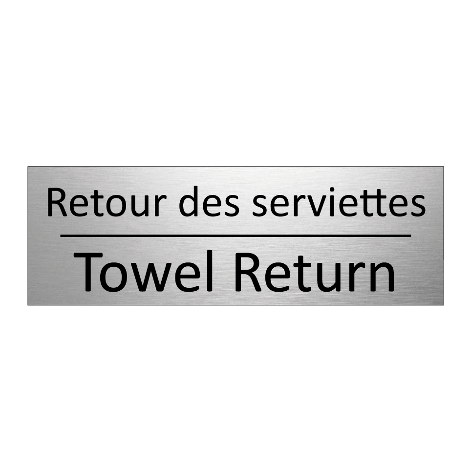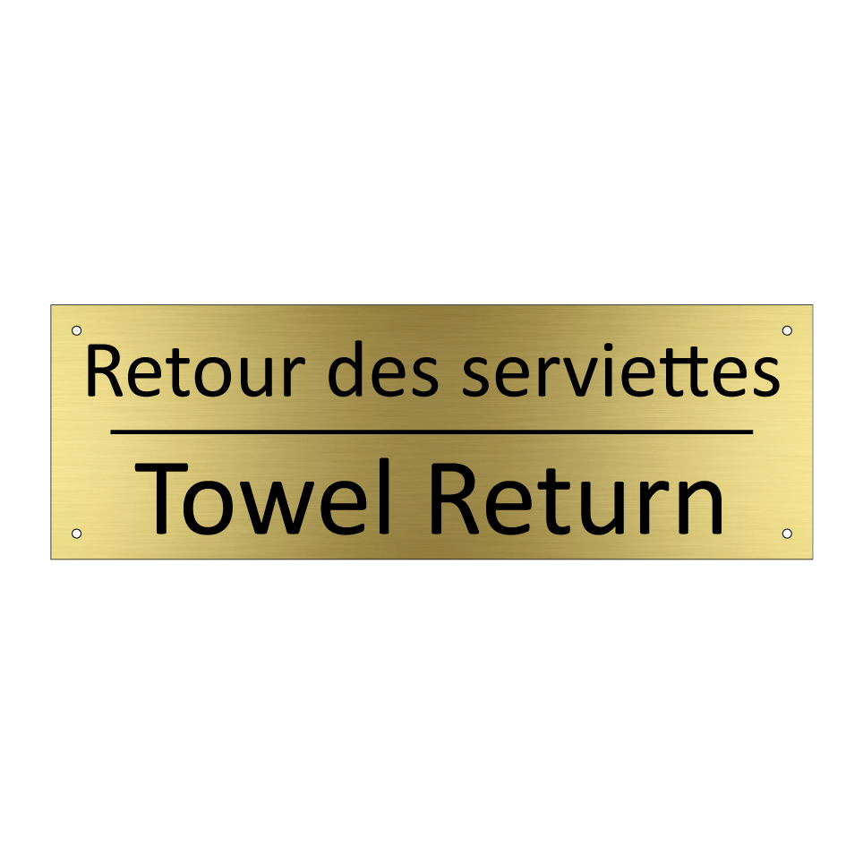Panneau d'information avec le texte Retour des serviettes|Towel Return en français et en anglais.