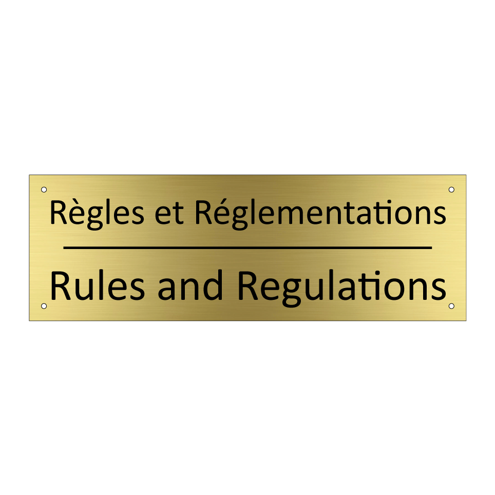 Panneau d'information avec le texte Règles et Réglementations|Rules and Regulations en français et en anglais.