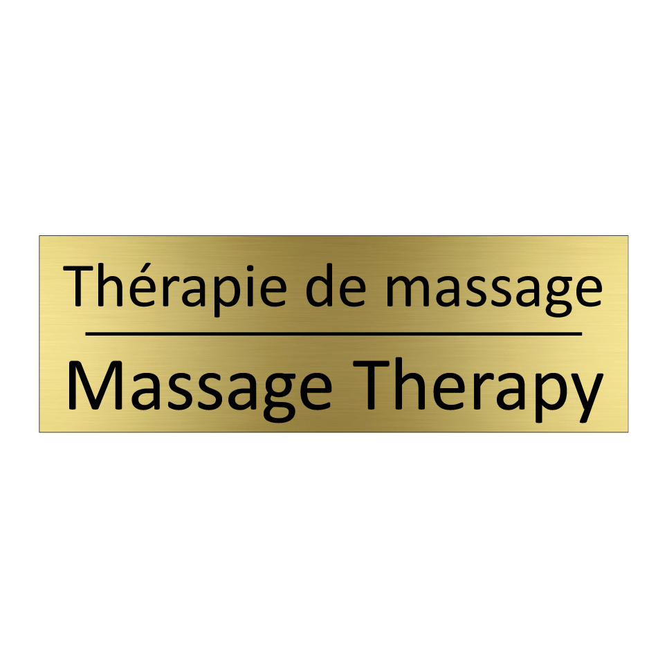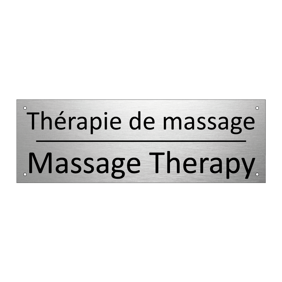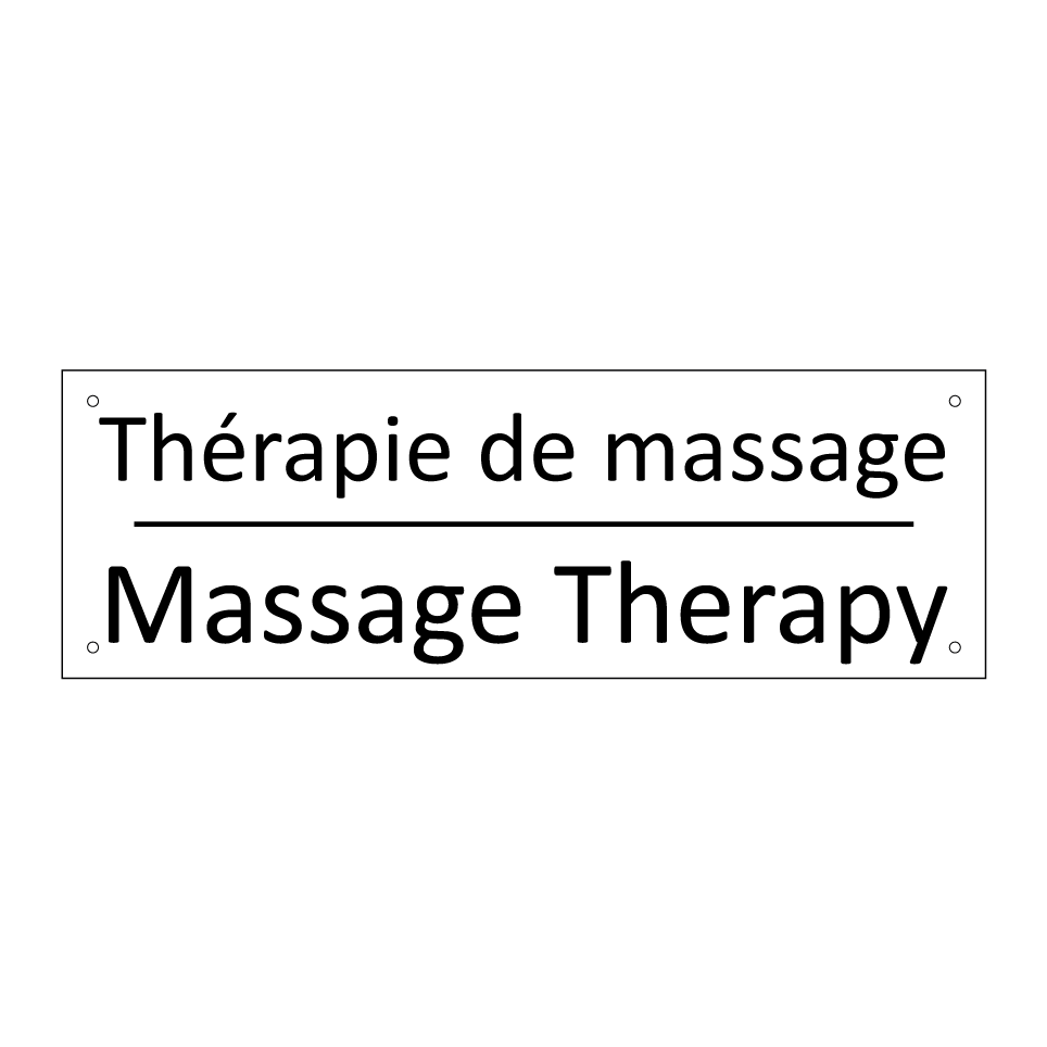 Panneau d'information avec le texte Thérapie de massage|Massage Therapy en français et en anglais.