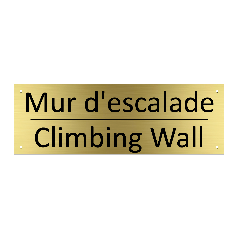 Panneau d'information avec le texte Mur d'escalade|Climbing Wall en français et en anglais.