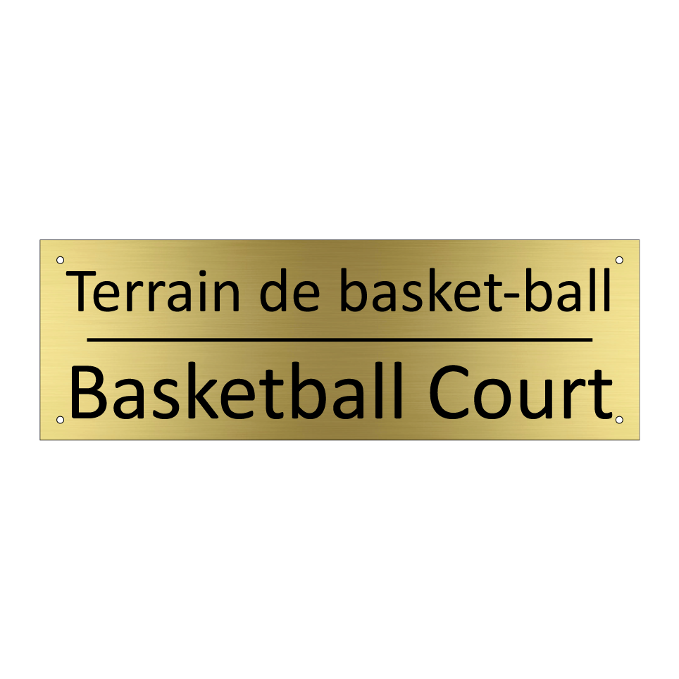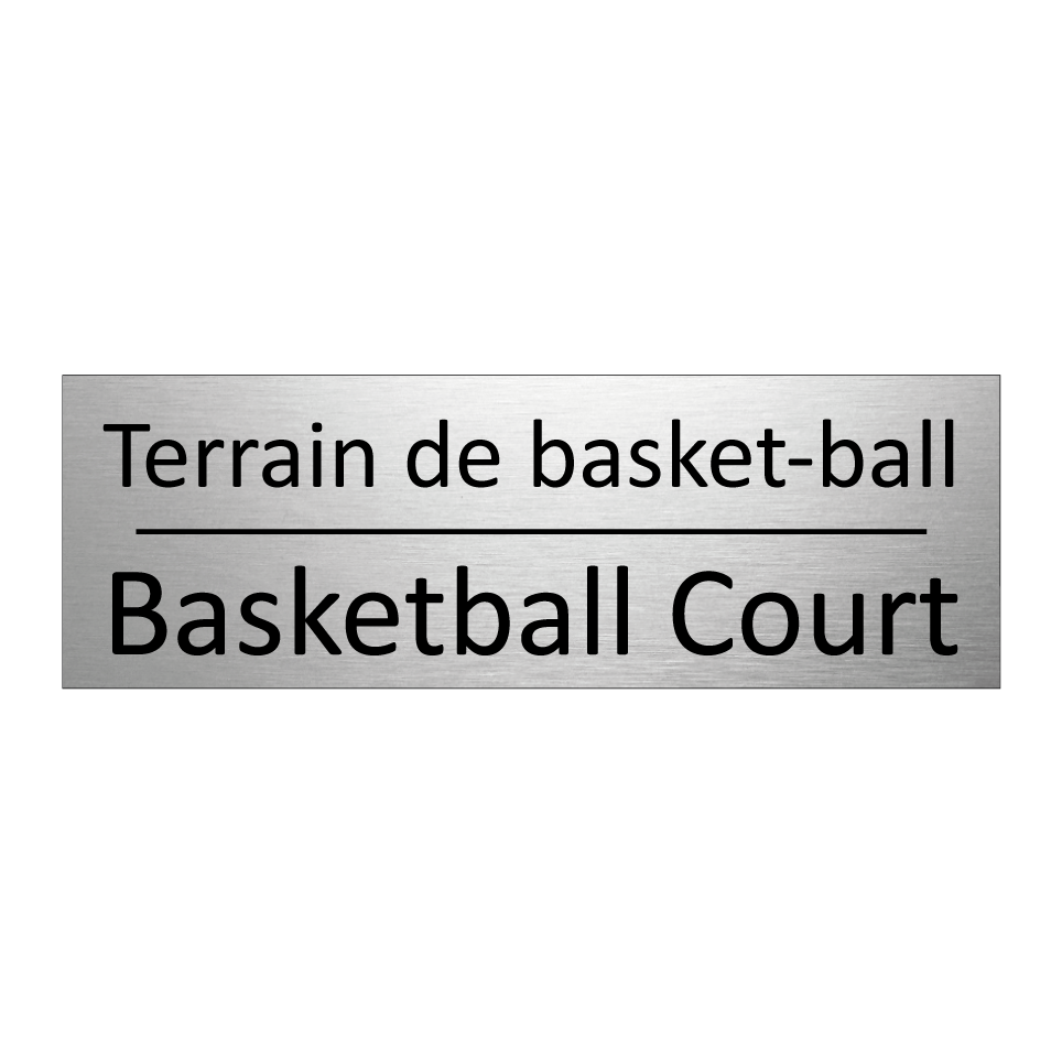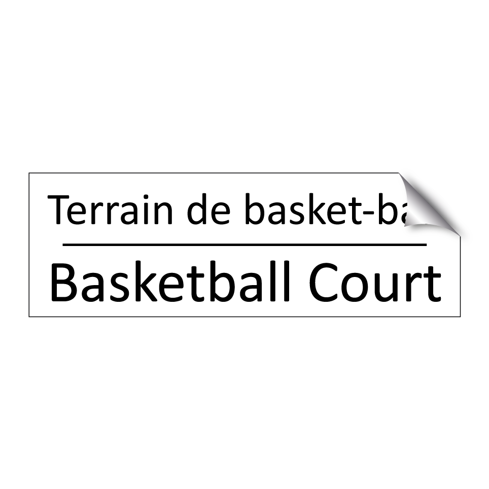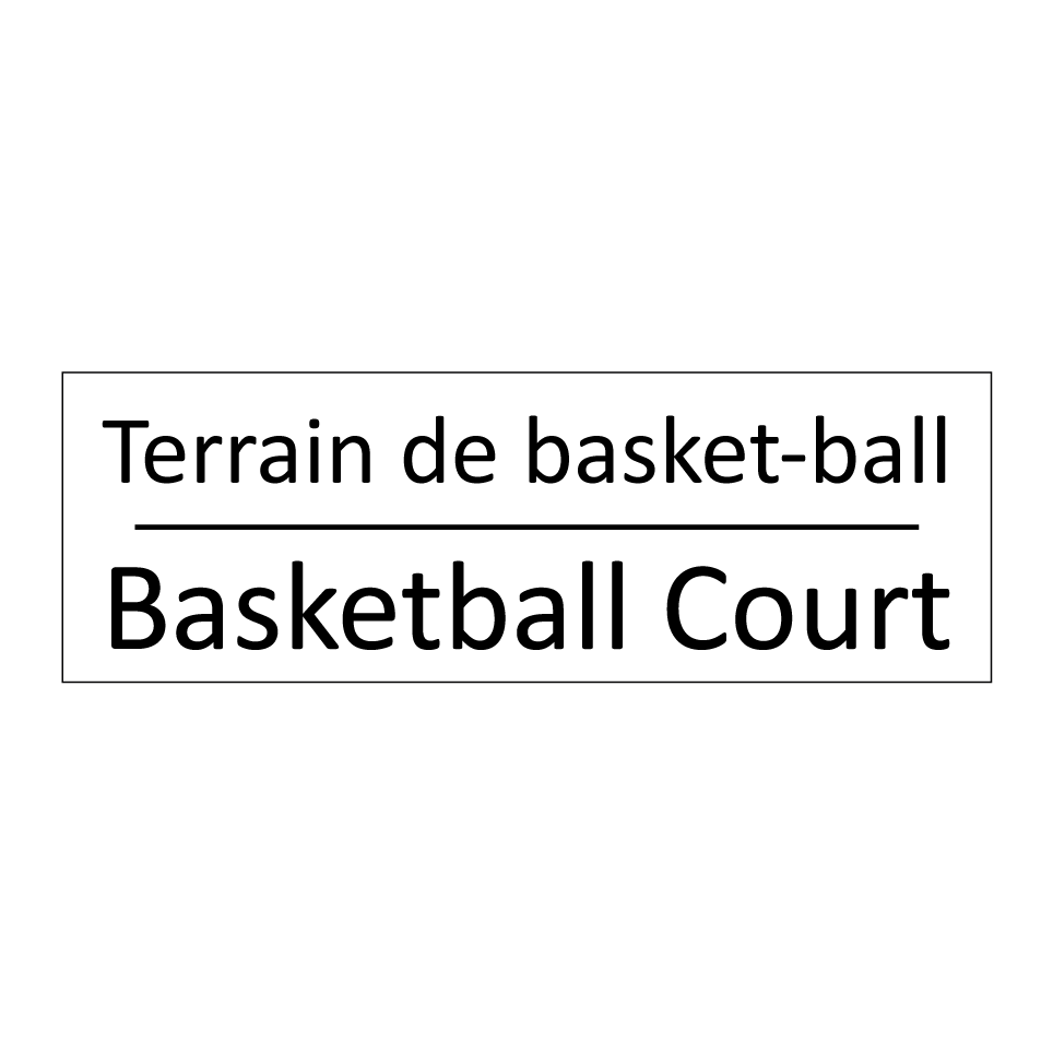 Panneau d'information avec le texte Terrain de basket-ball|Basketball Court en français et en anglais.