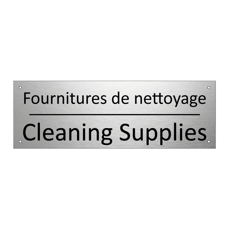 Panneau d'information avec le texte Fournitures de nettoyage|Cleaning Supplies en français et en anglais.