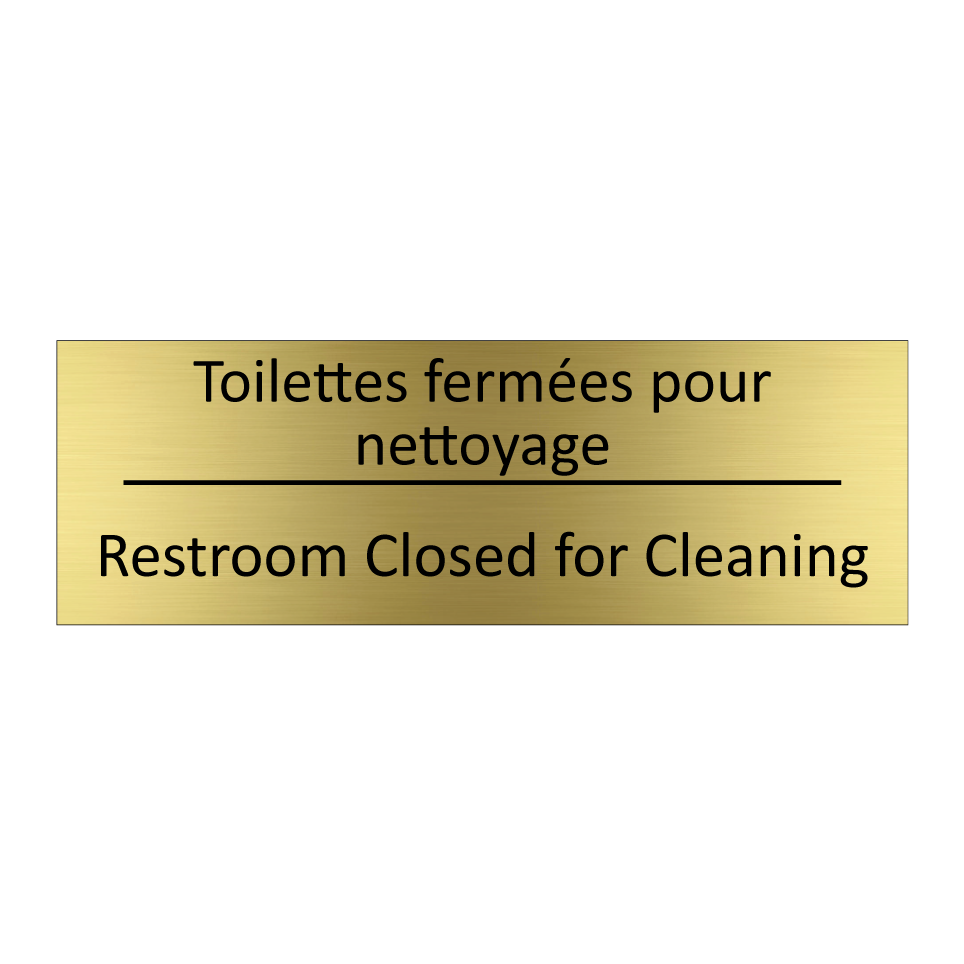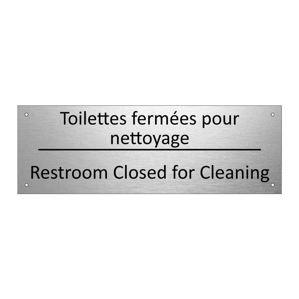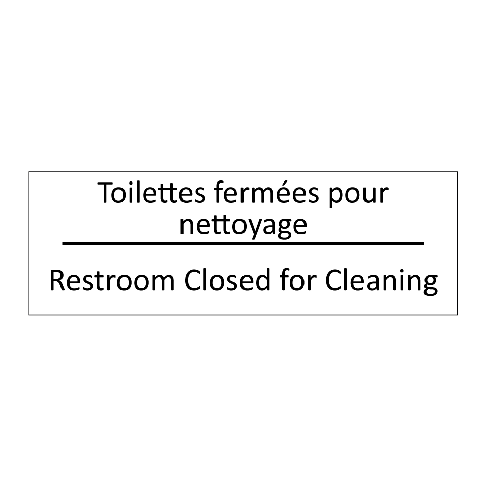 Panneau d'information avec le texte Toilettes fermées pour nettoyage|Restroom Closed for Cleaning en français et en anglais.