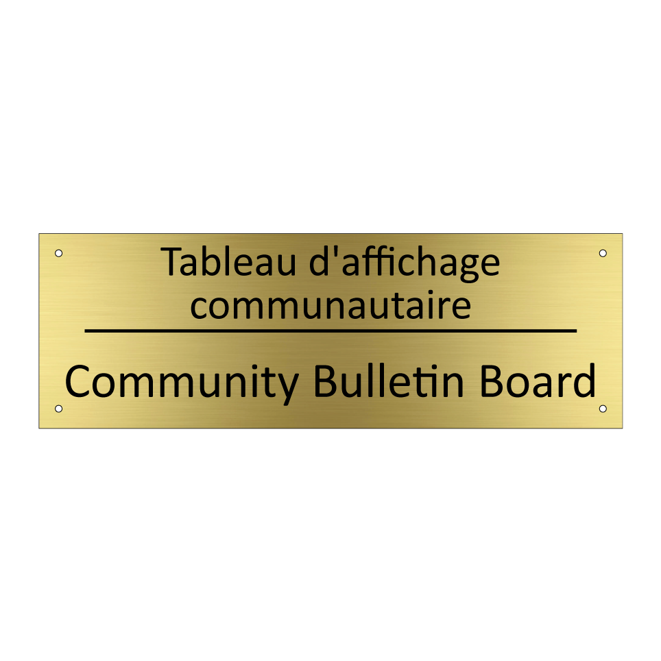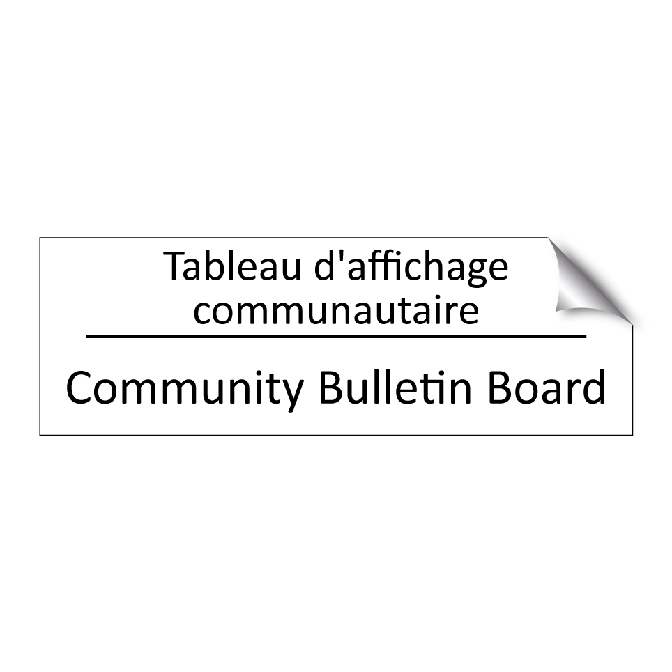 Panneau d'information avec le texte Tableau d'affichage communautaire|Community Bulletin Board en français et en anglais.