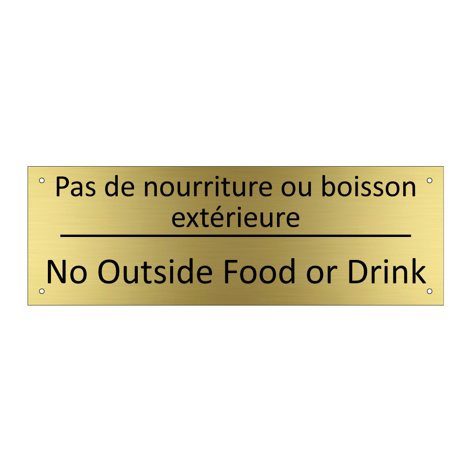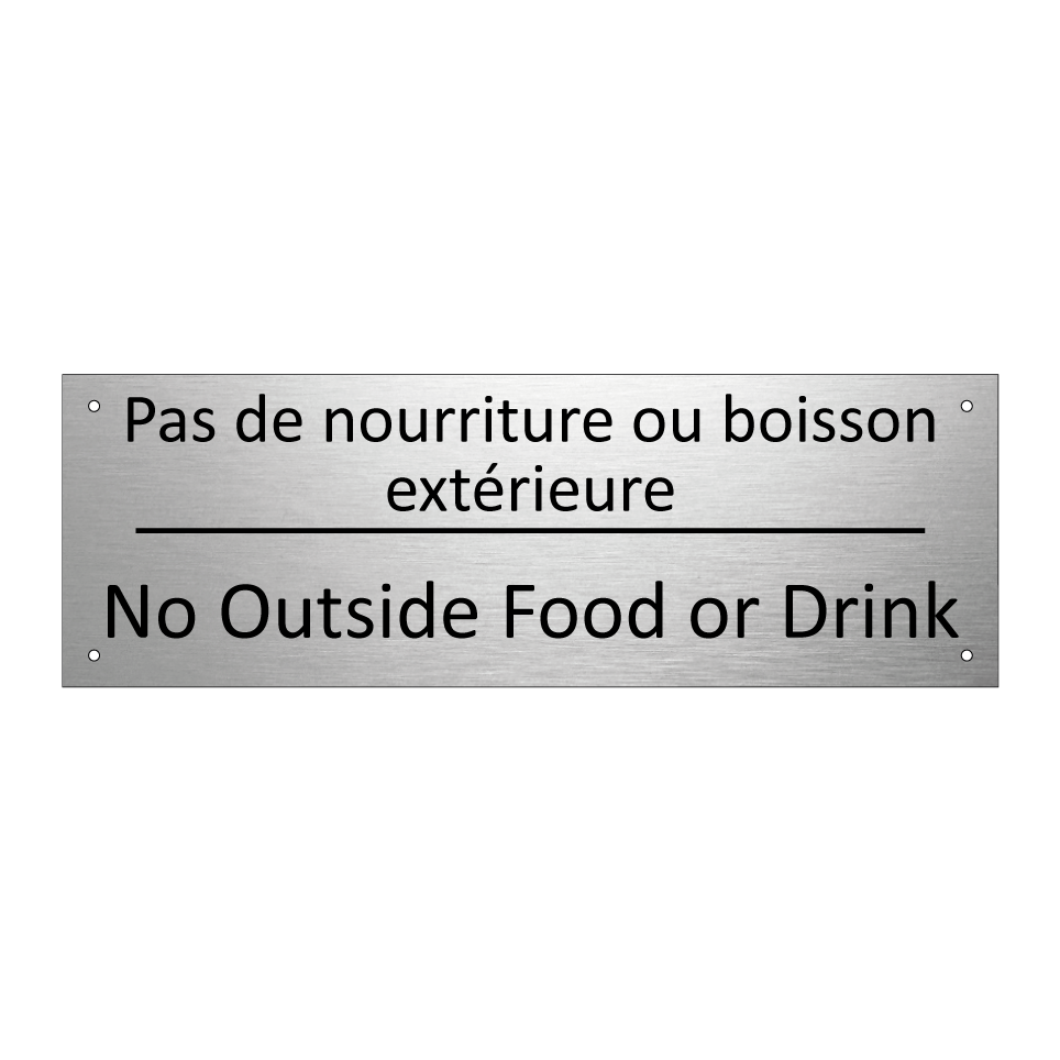 Panneau d'information avec le texte Pas de nourriture ou boisson extérieure|No Outside Food or Drink en français et en anglais.