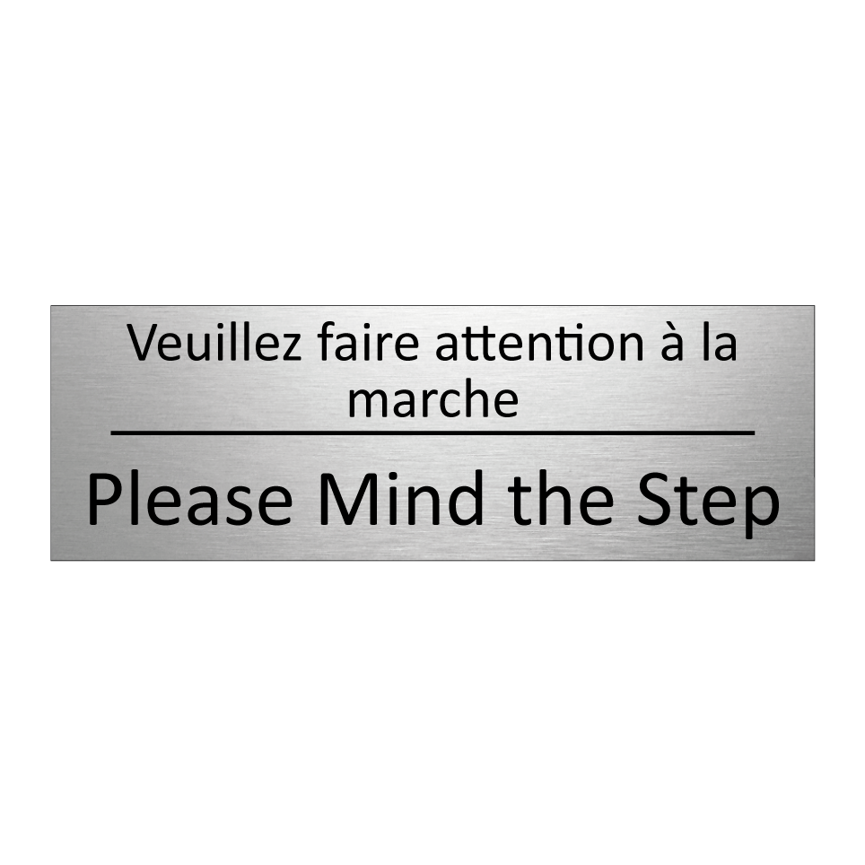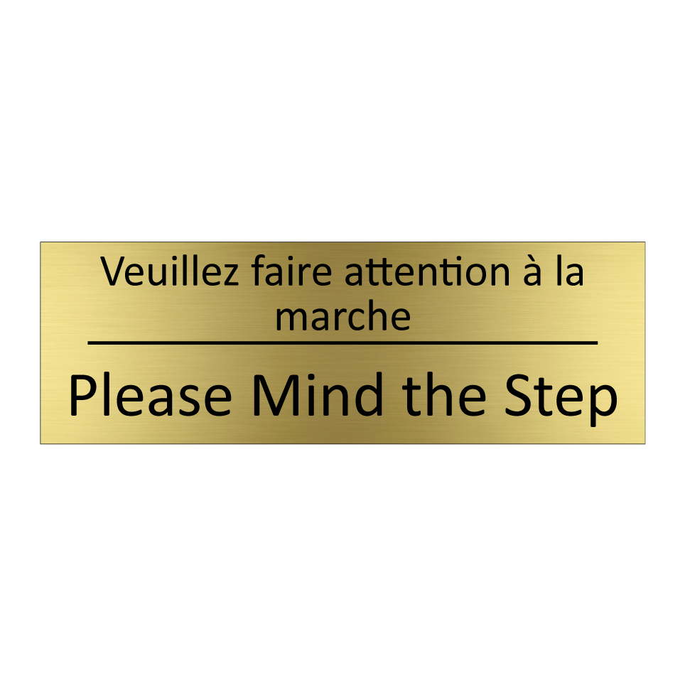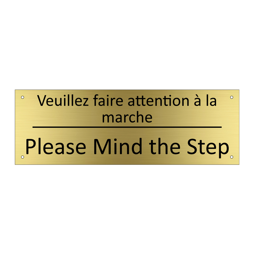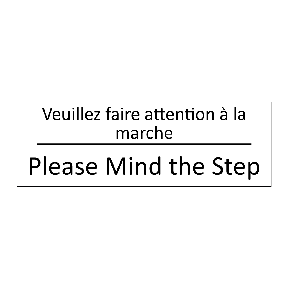 Panneau d'information avec le texte Veuillez faire attention à la marche|Please Mind the Step en français et en anglais.