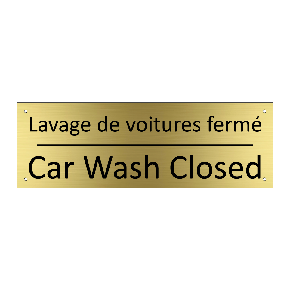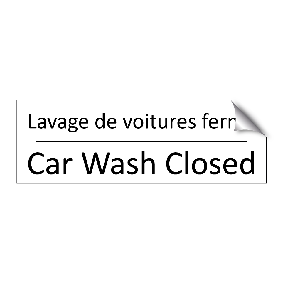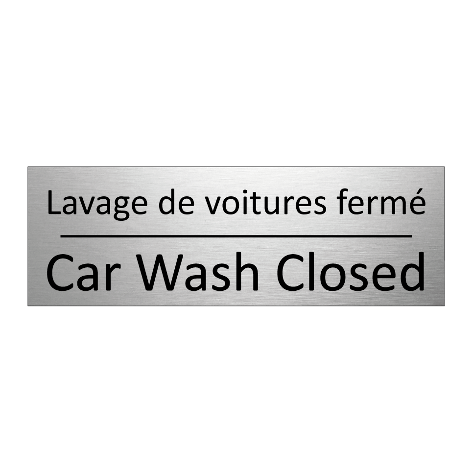 Panneau d'information avec le texte Lavage de voitures fermé|Car Wash Closed en français et en anglais.