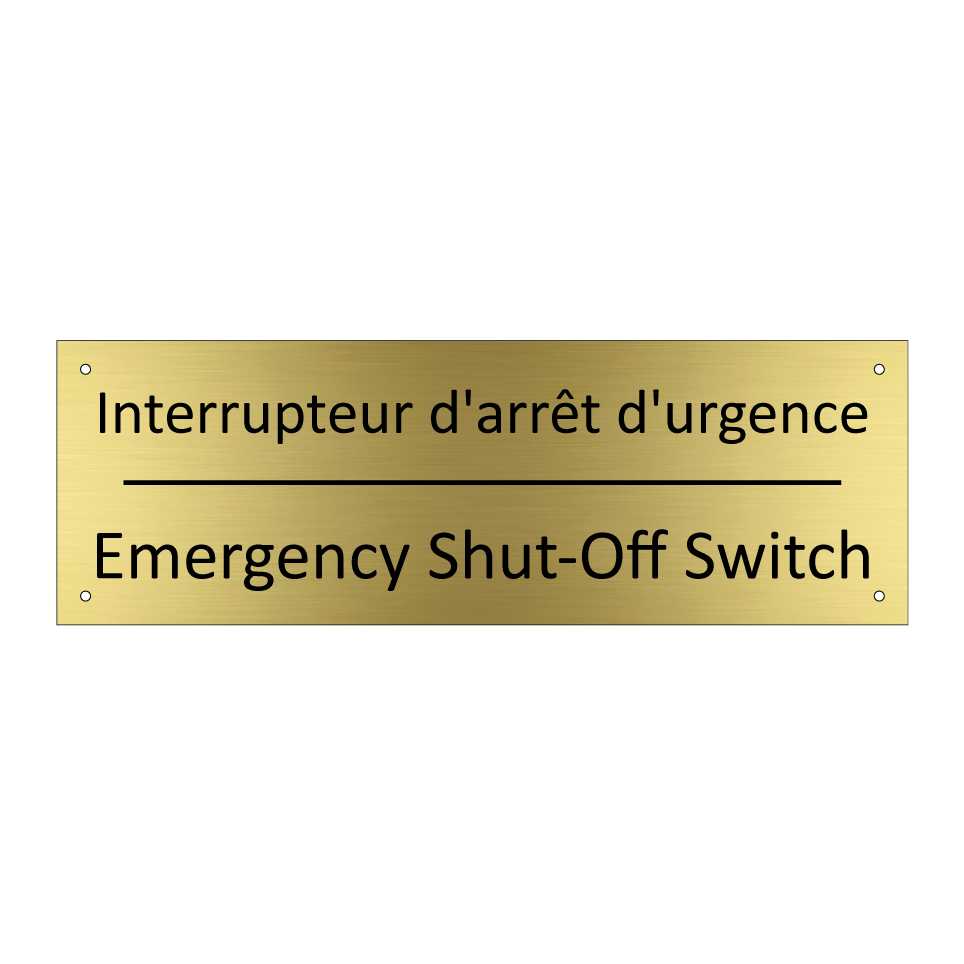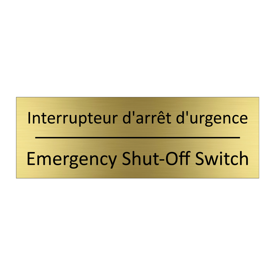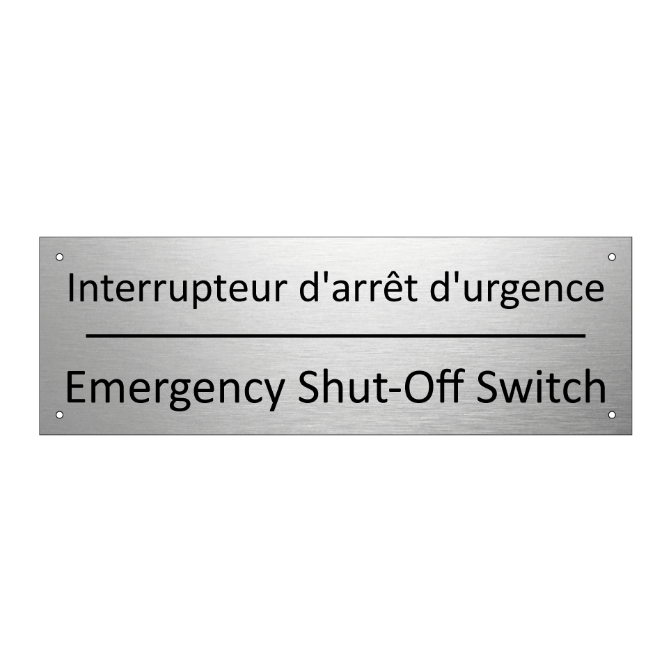 Panneau d'information avec le texte Interrupteur d'arrêt d'urgence|Emergency Shut-Off Switch en français et en anglais.