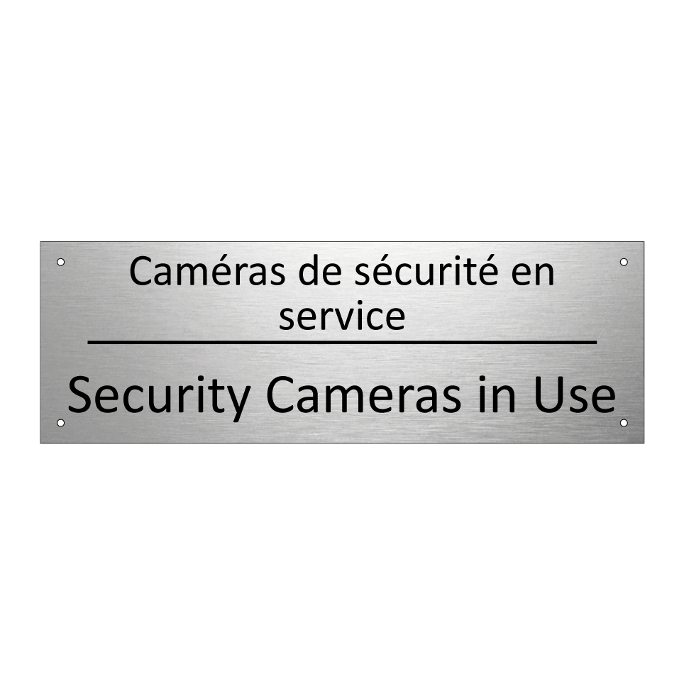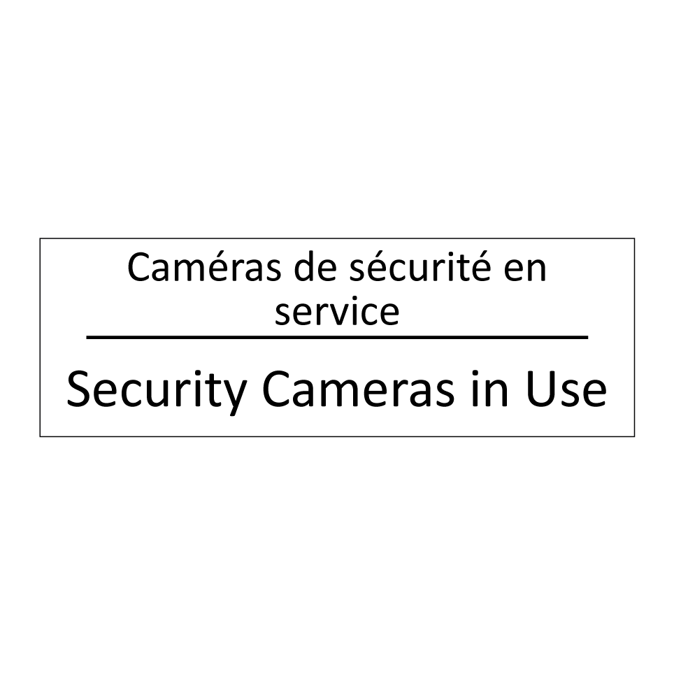 Panneau d'information avec le texte Caméras de sécurité en service|Security Cameras in Use en français et en anglais.