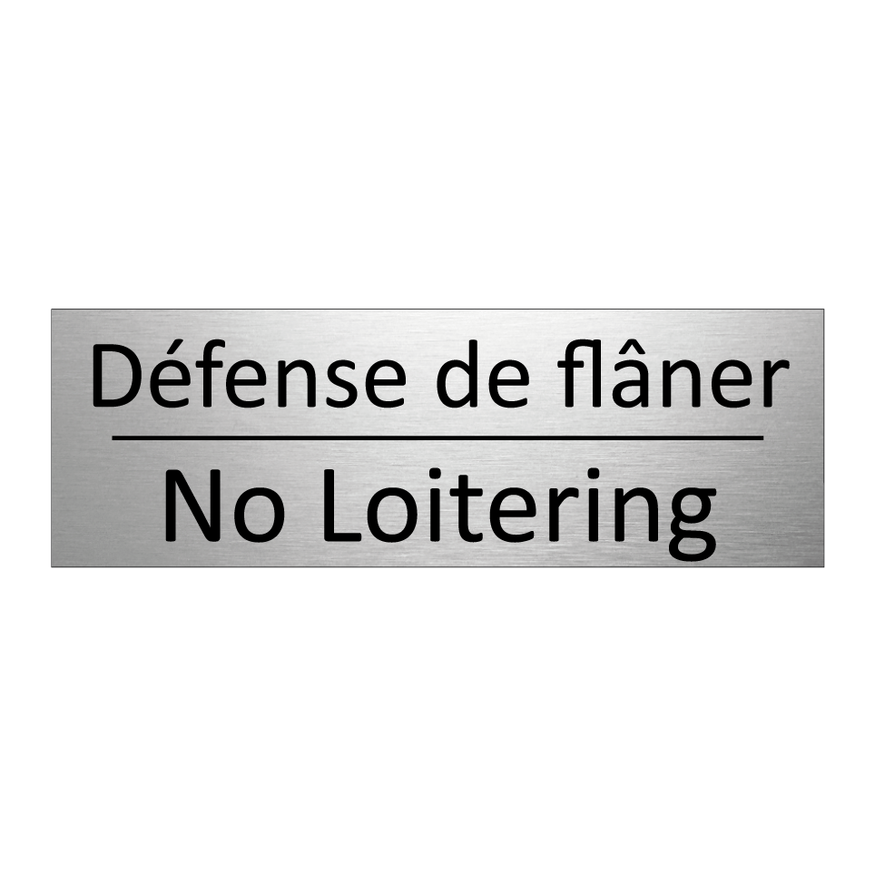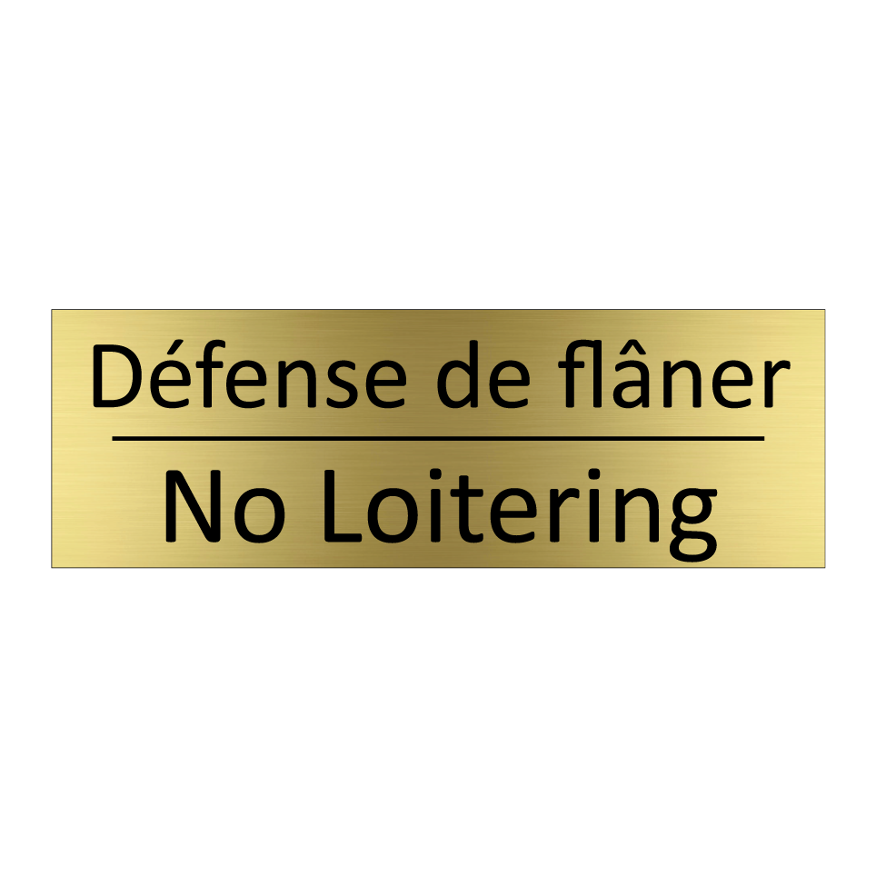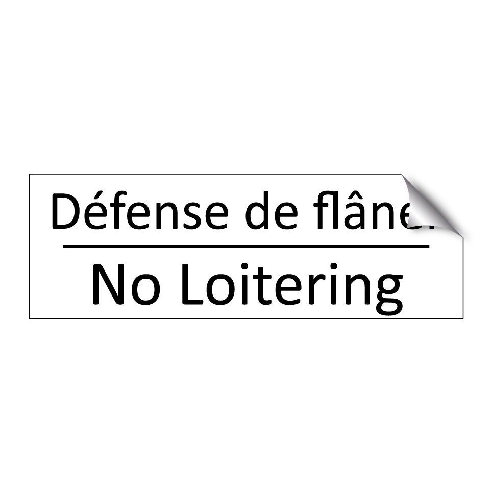 Panneau d'information avec le texte Défense de flâner|No Loitering en français et en anglais.