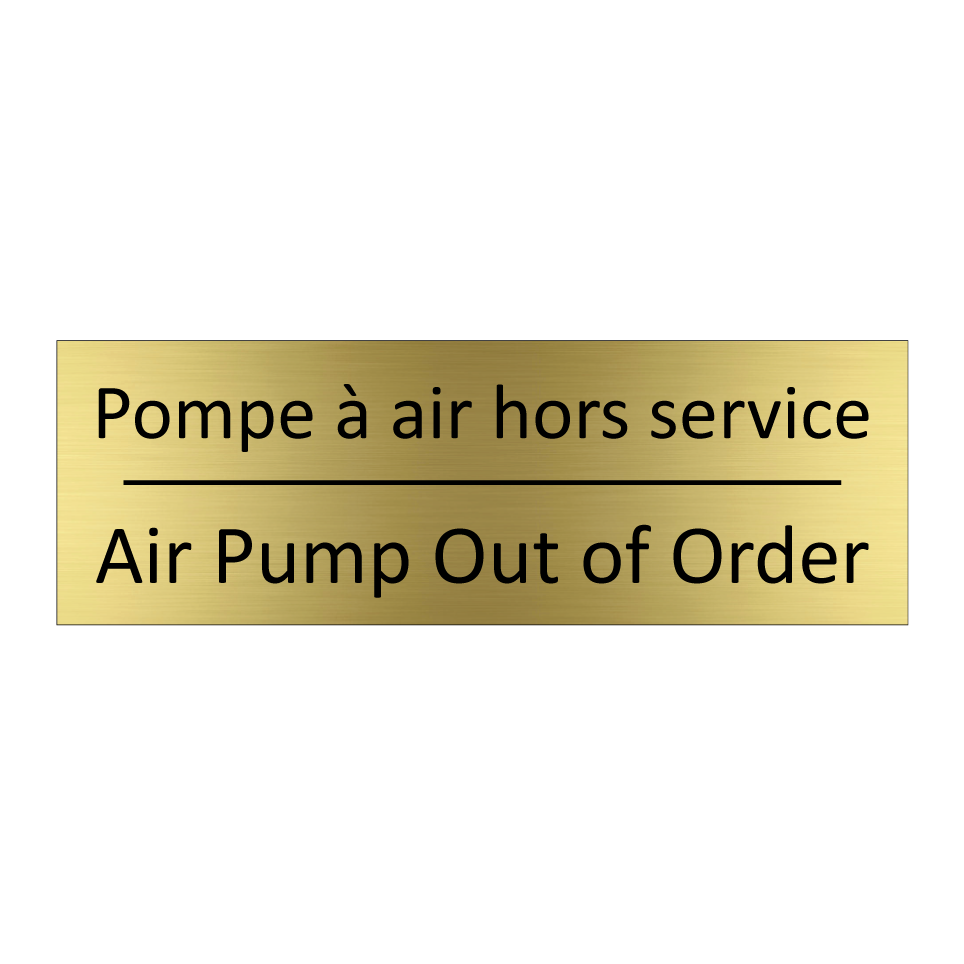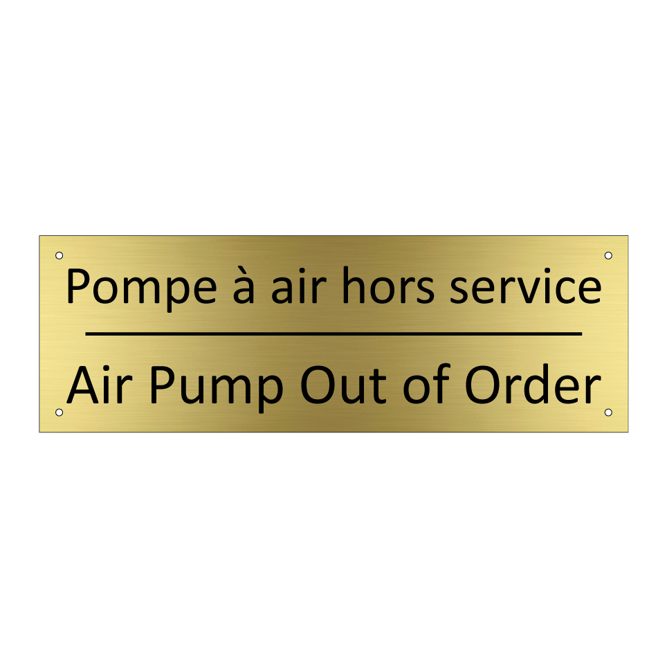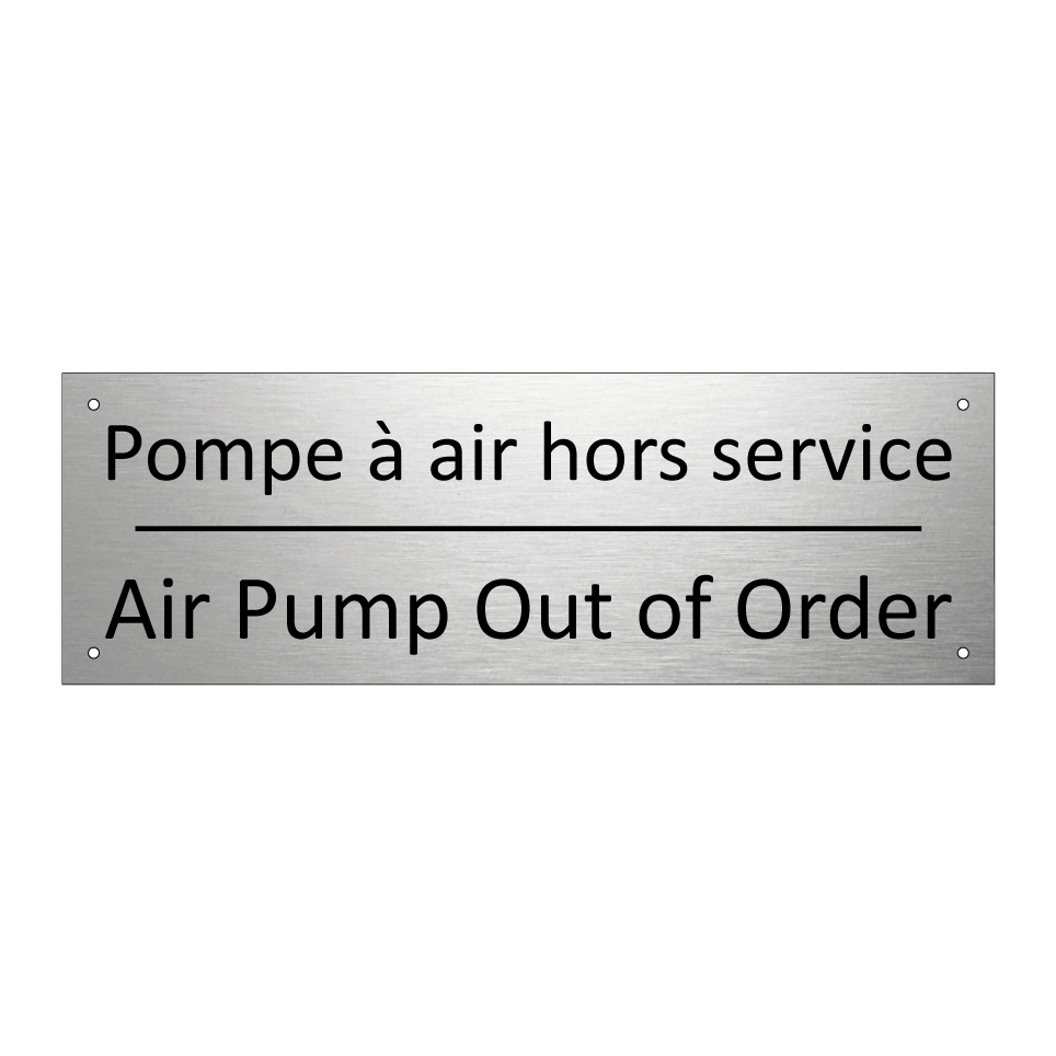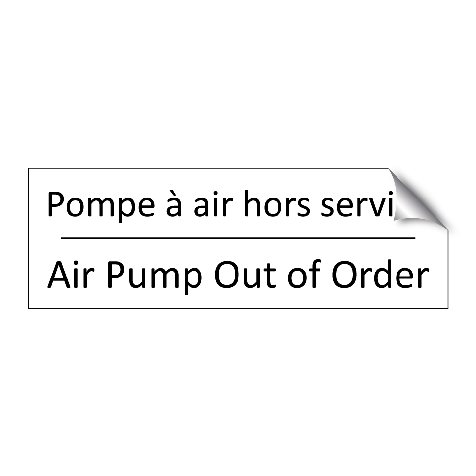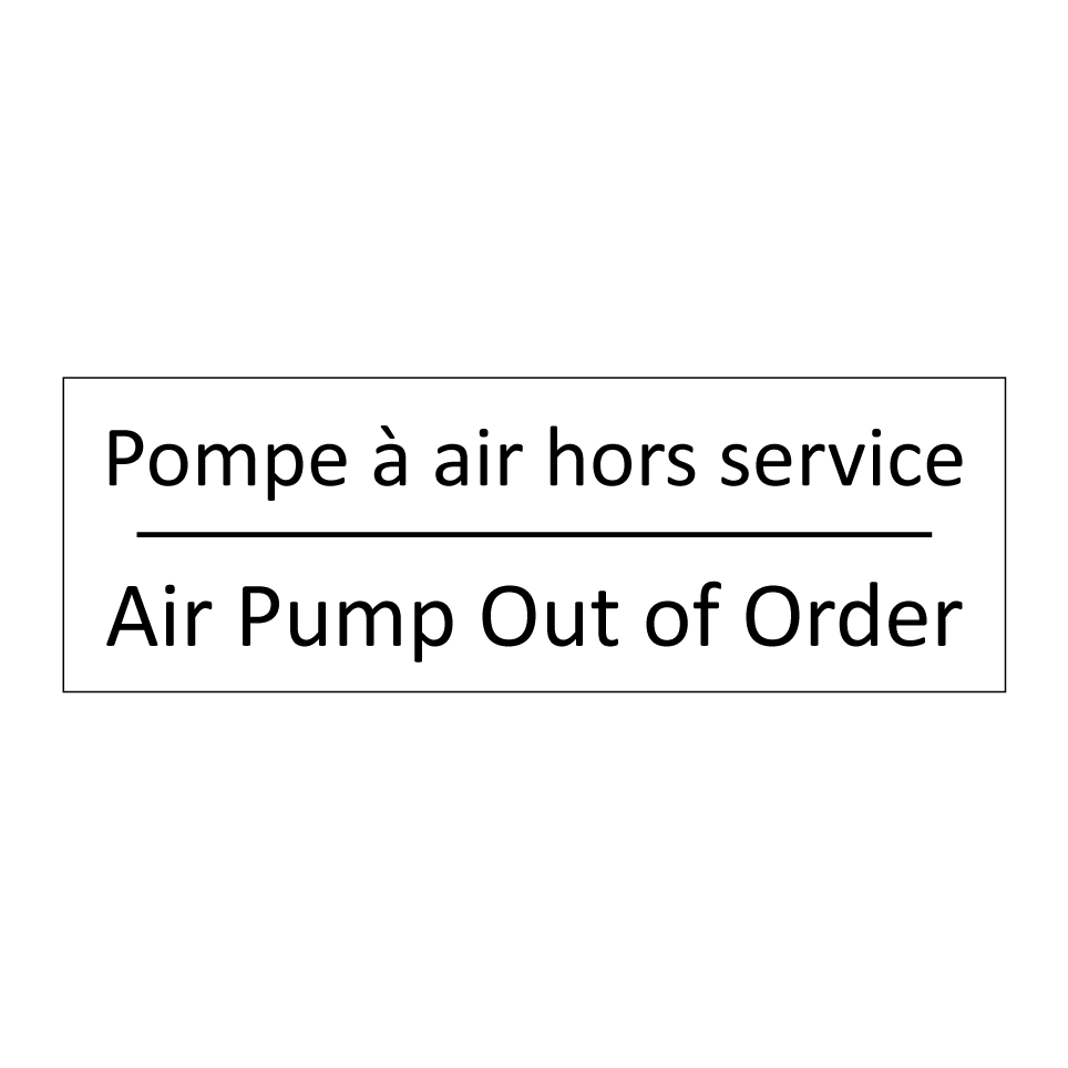 Panneau d'information avec le texte Pompe à air hors service|Air Pump Out of Order en français et en anglais.