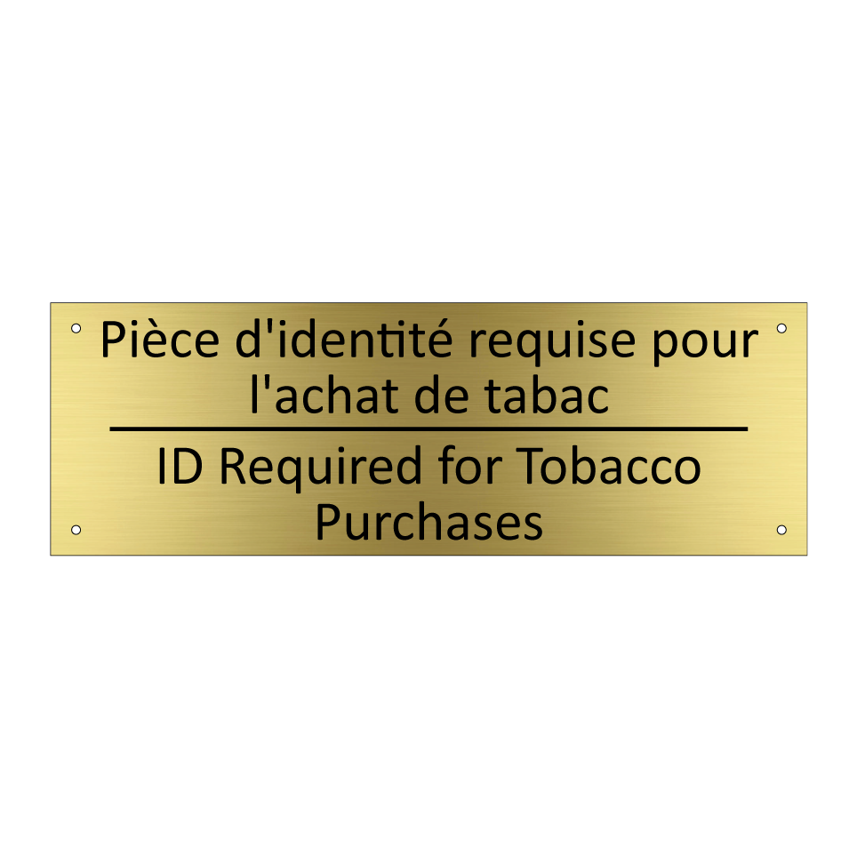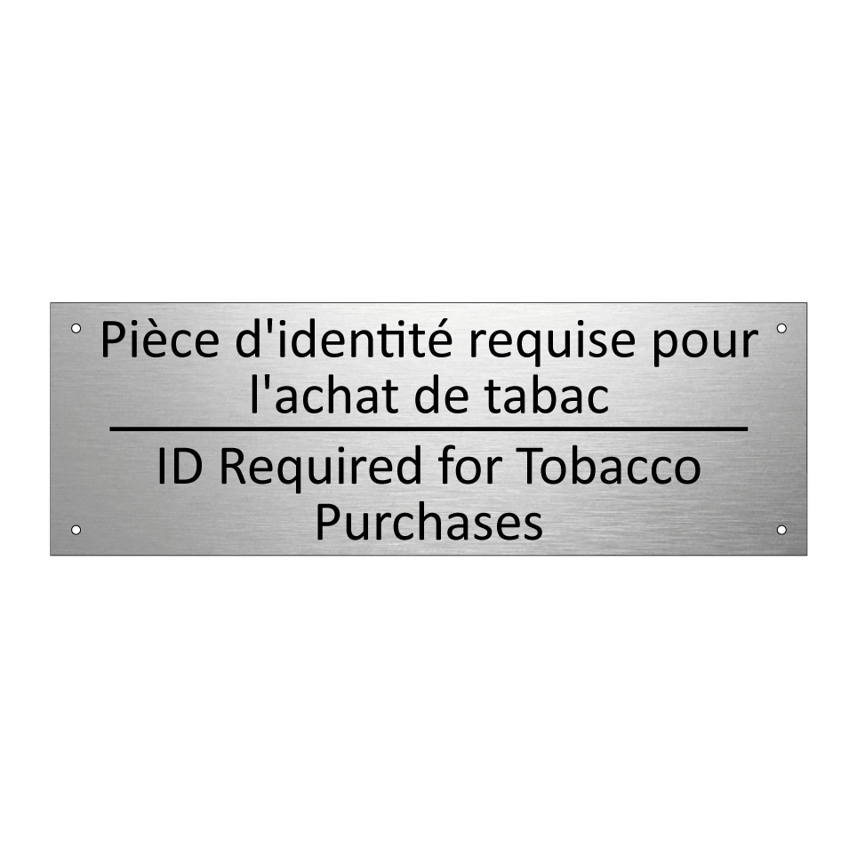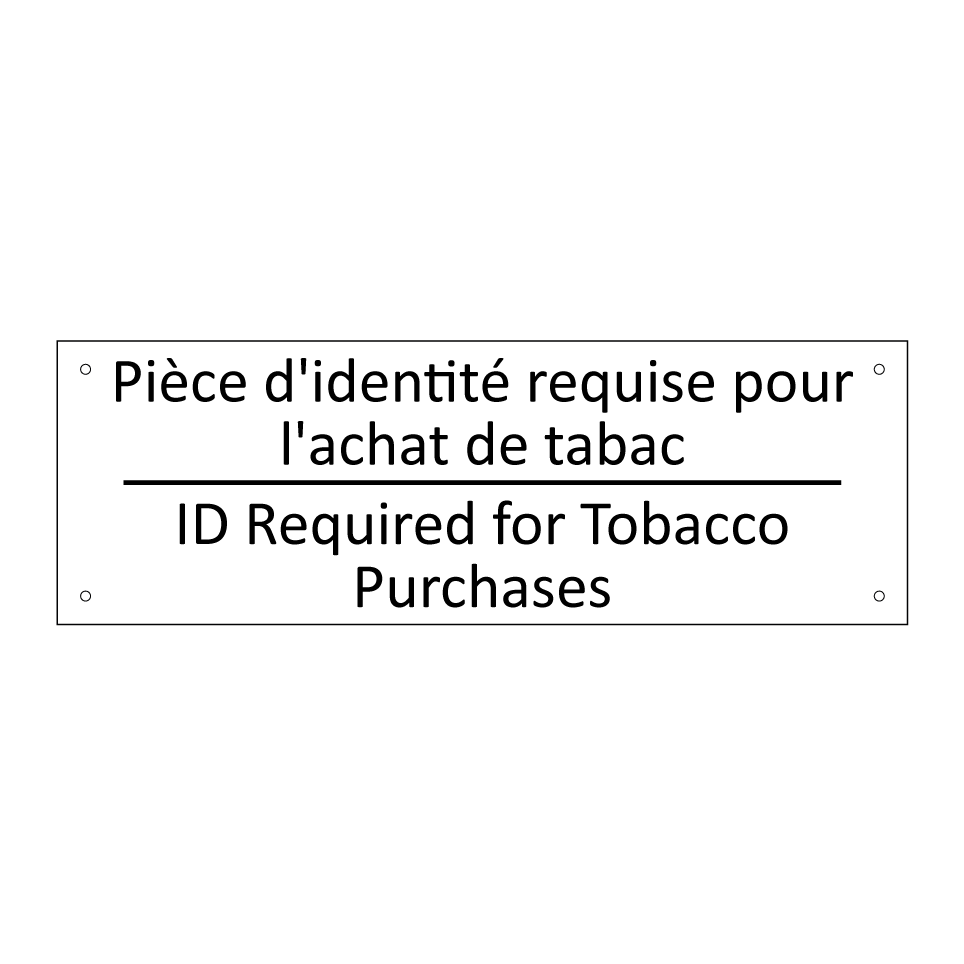Panneau d'information avec le texte Pièce d'identité requise pour l'achat de tabac|ID Required for Tobacco Purchases en français et en anglais.