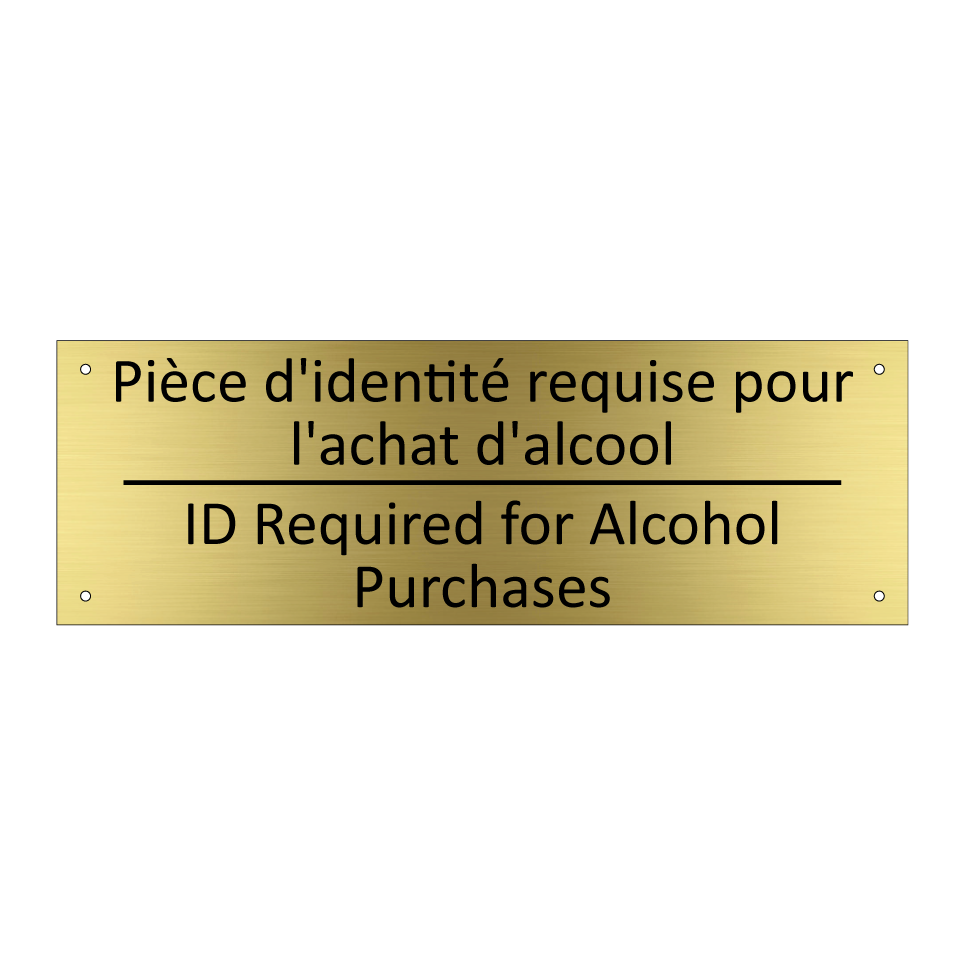 Panneau d'information avec le texte Pièce d'identité requise pour l'achat d'alcool|ID Required for Alcohol Purchases en français et en anglais.