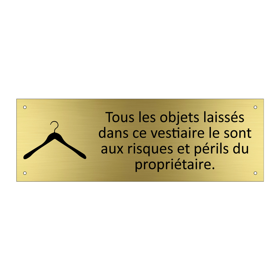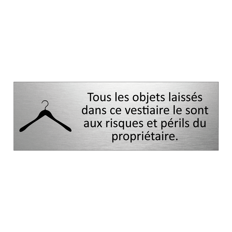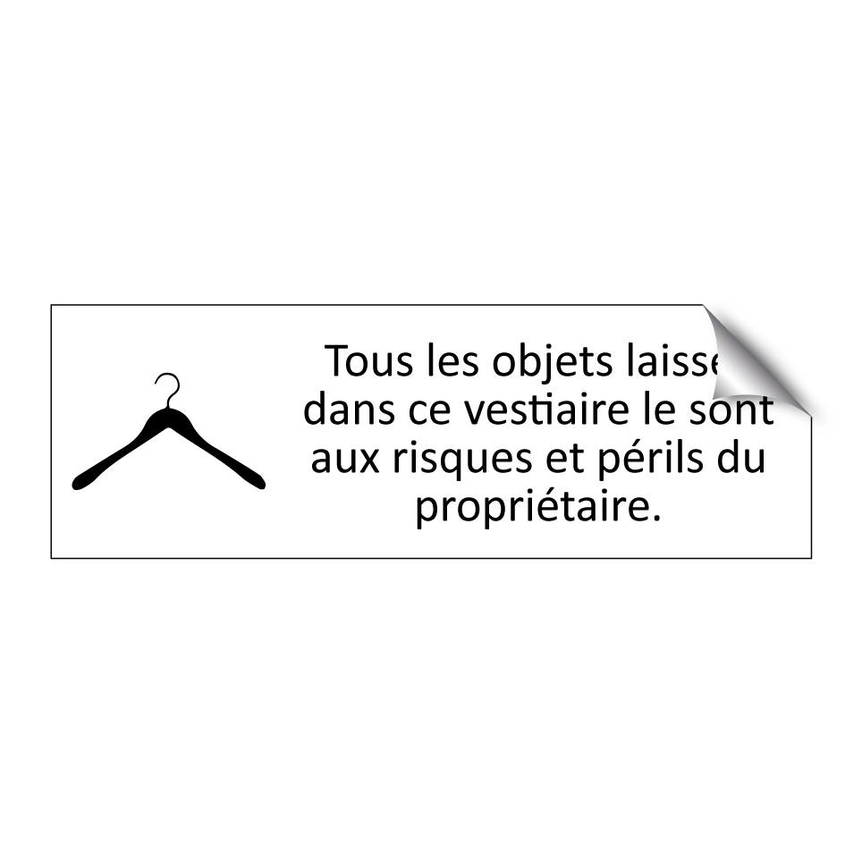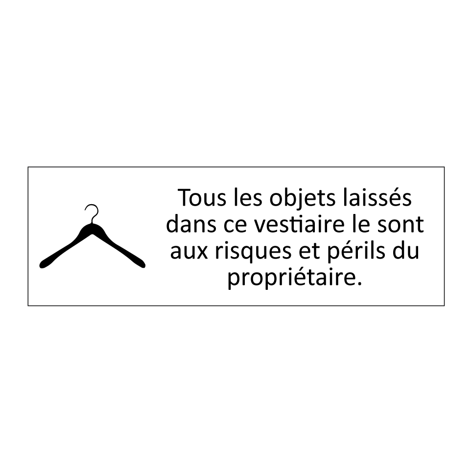 Panneau d'information avec le texte Tous les objets laissés dans ce vestiaire le sont aux risques et périls du propriétaire. et une symbolique claire pour une meilleure visibilité.