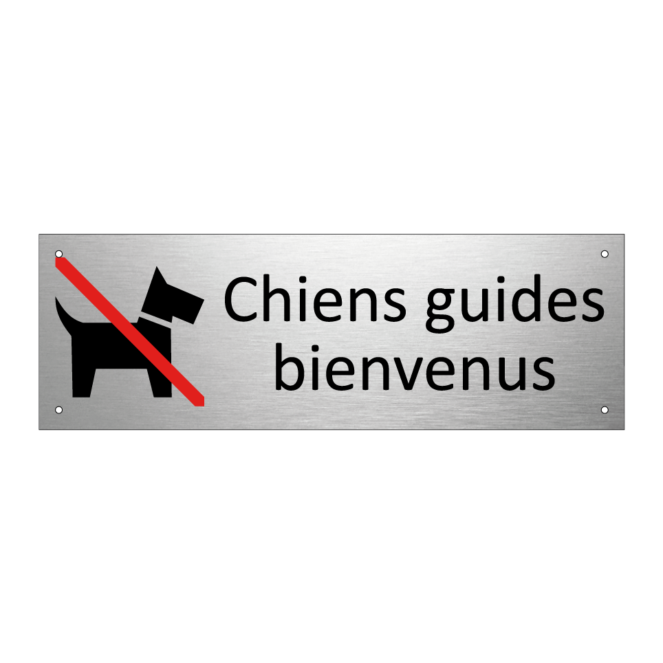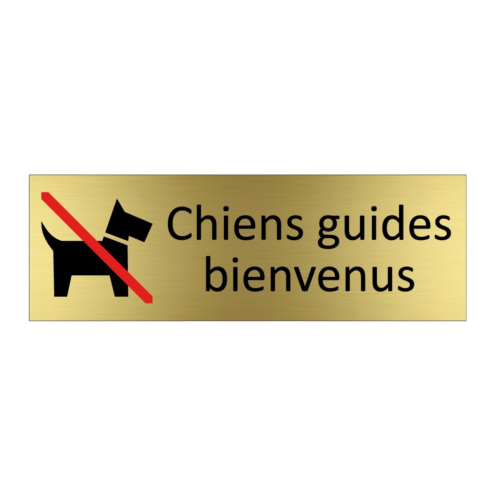 Panneau d'information avec le texte Chiens guides bienvenus et une symbolique claire pour une meilleure visibilité.