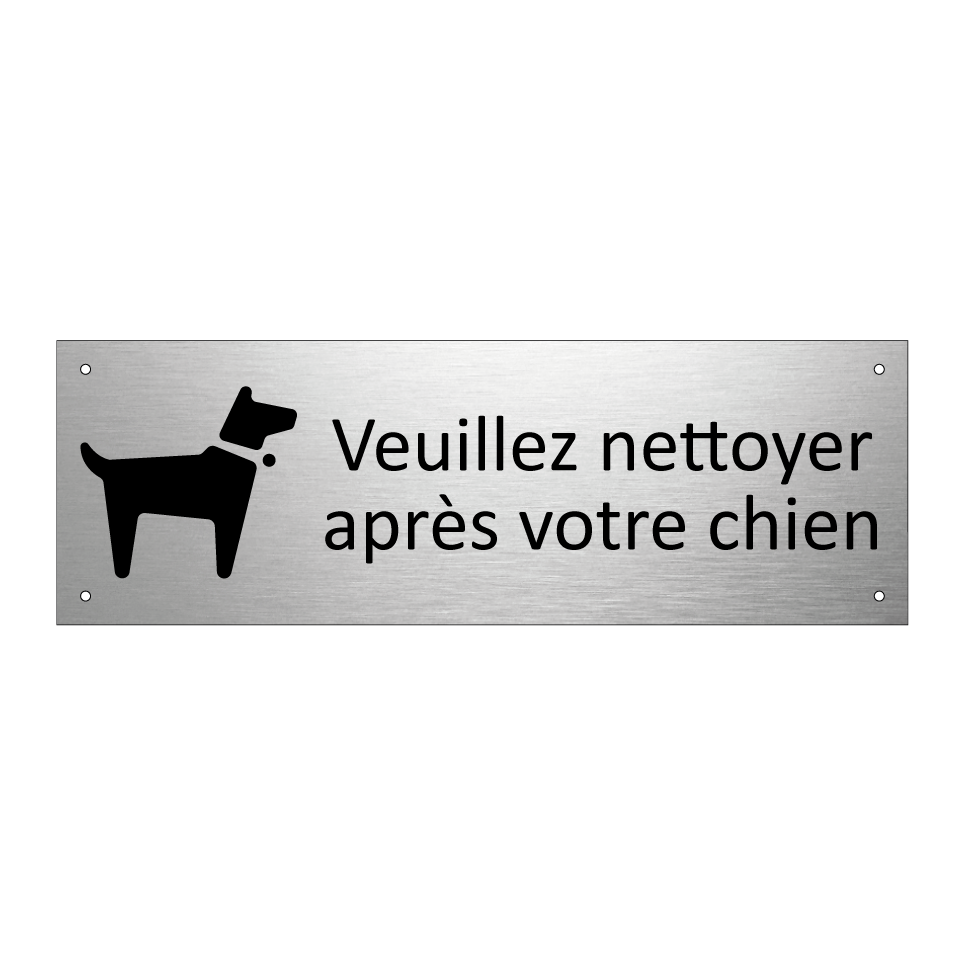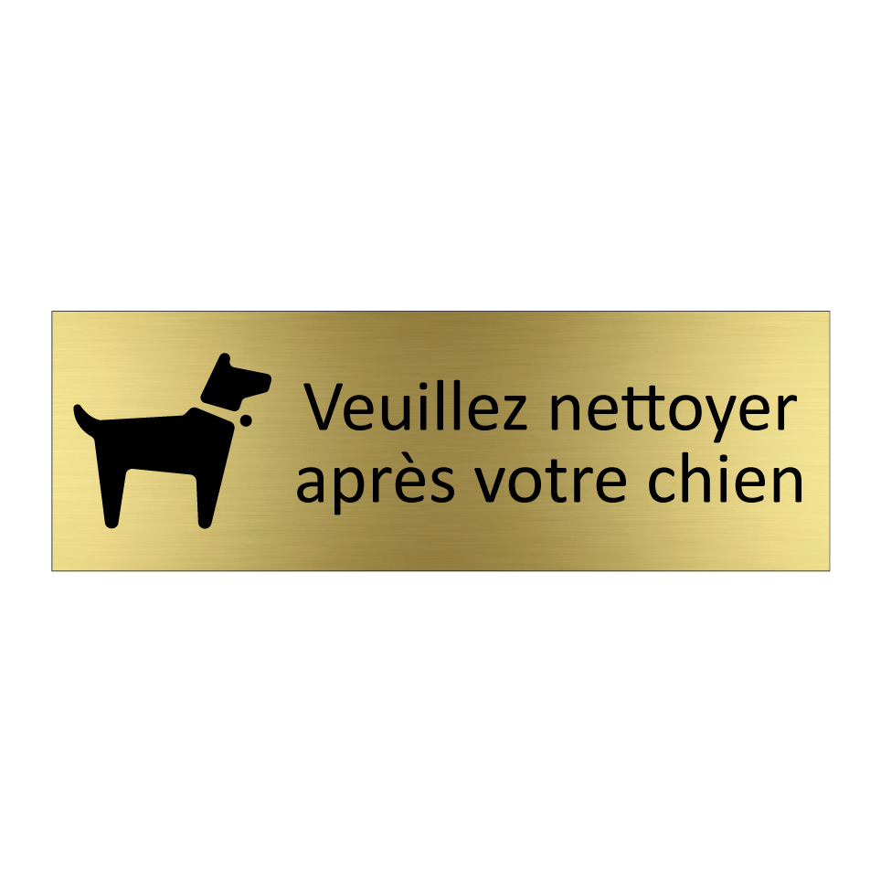 Panneau d'information avec le texte Veuillez nettoyer après votre chien et une symbolique claire pour une meilleure visibilité.
