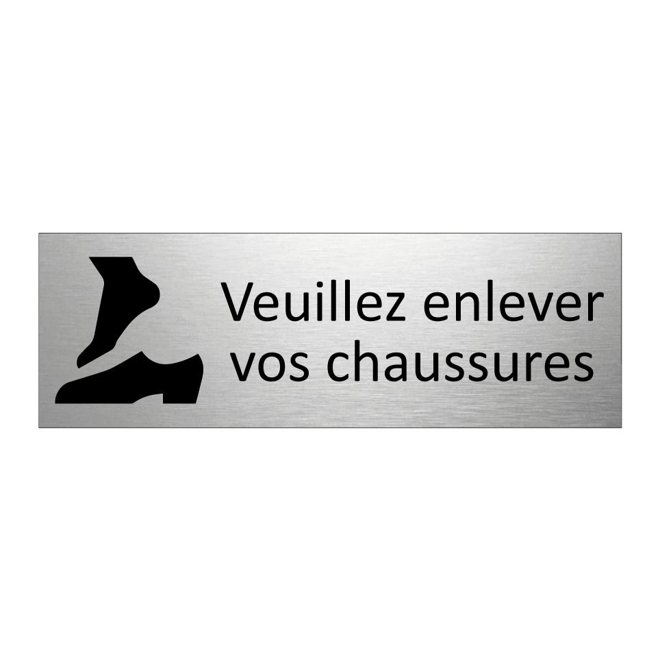 Panneau d'information avec le texte Veuillez enlever vos chaussures et une symbolique claire pour une meilleure visibilité.