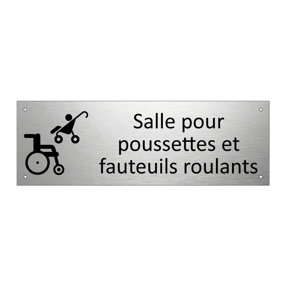 Panneau d'information avec le texte Salle pour poussettes et fauteuils roulants et une symbolique claire pour une meilleure visibilité.
