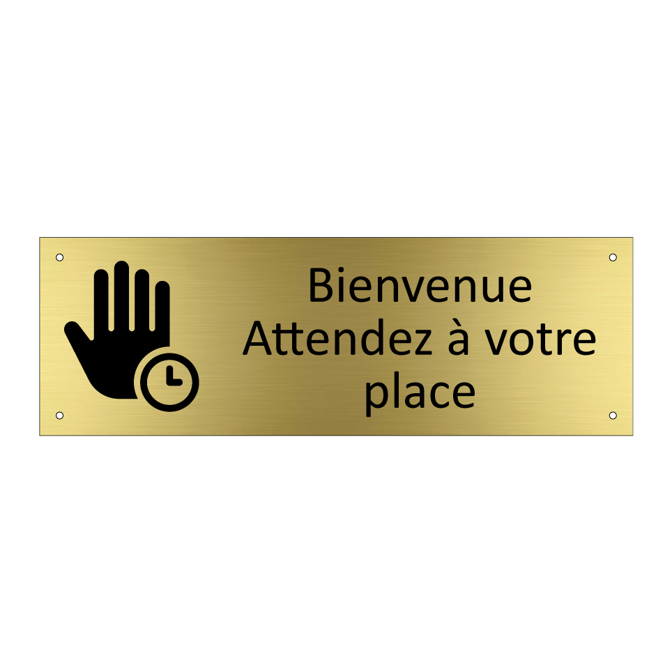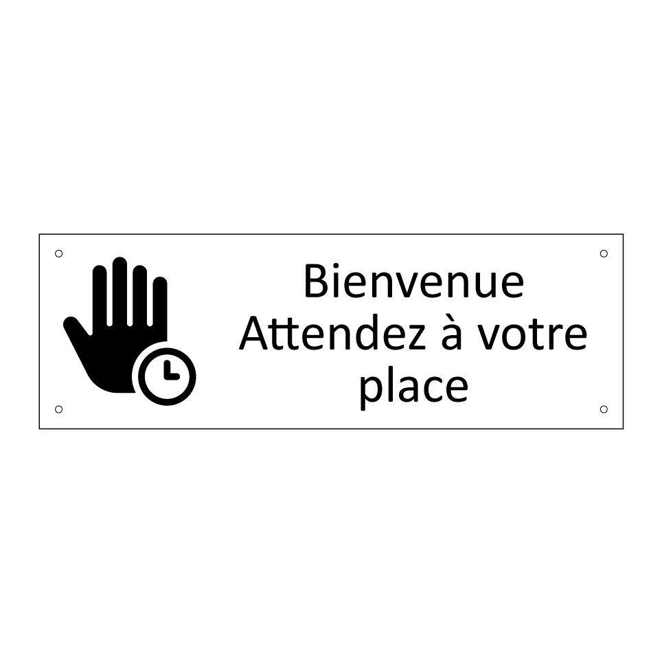 Panneau d'information avec le texte Bienvenue Attendez à votre place et une symbolique claire pour une meilleure visibilité.