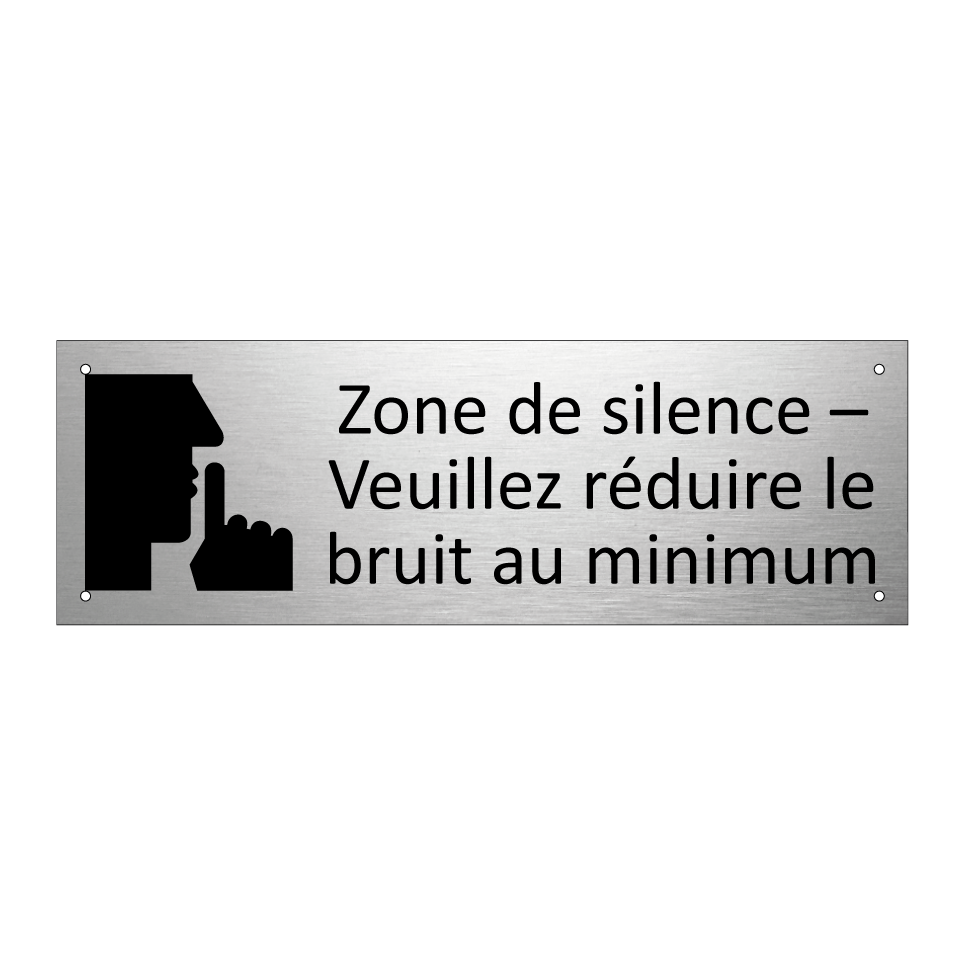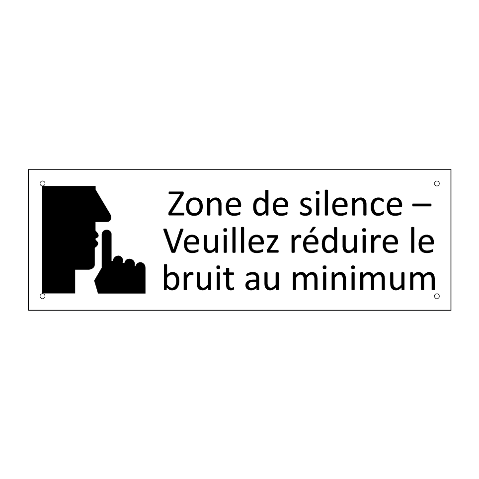 Panneau d'information avec le texte Zone de silence – Veuillez réduire le bruit au minimum et une symbolique claire pour une meilleure visibilité.
