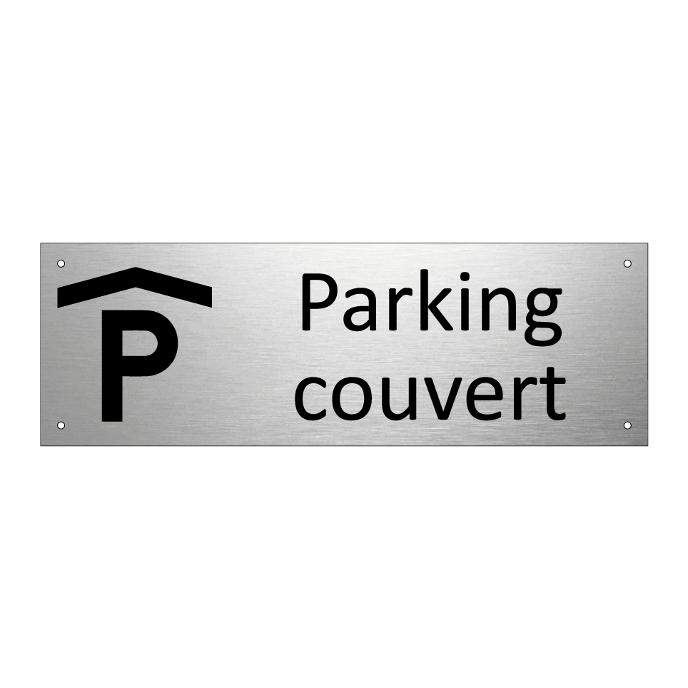 Panneau d'information avec le texte Parking couvert et une symbolique claire pour une meilleure visibilité.
