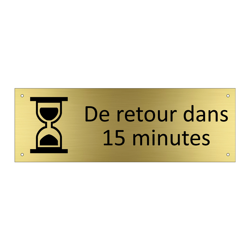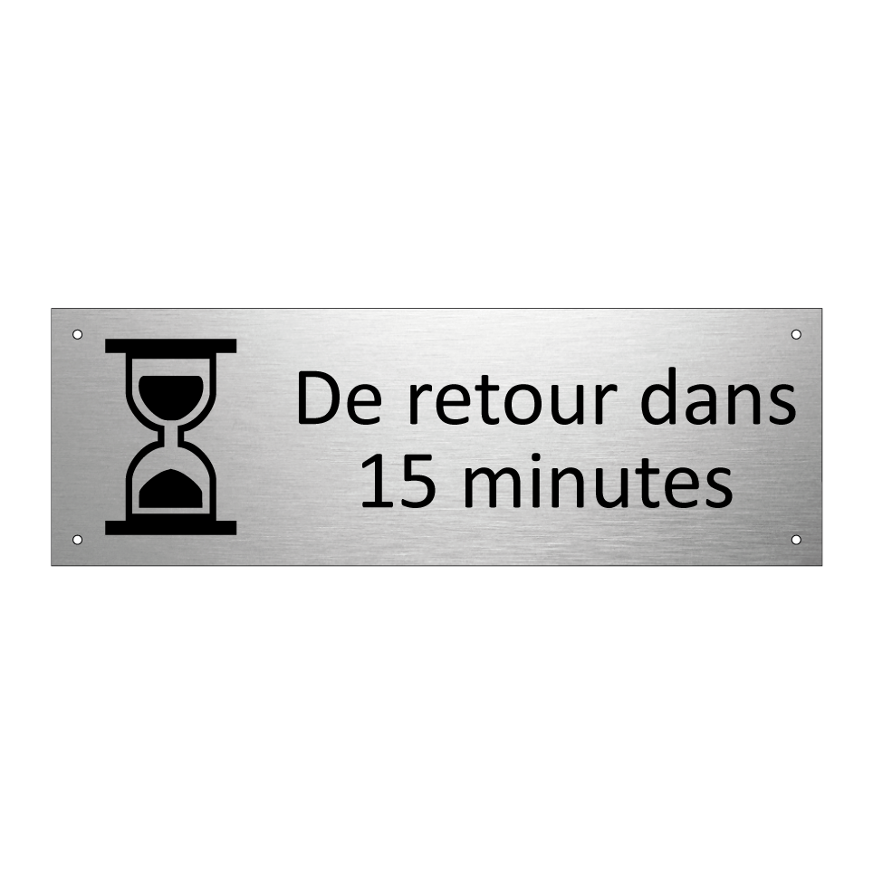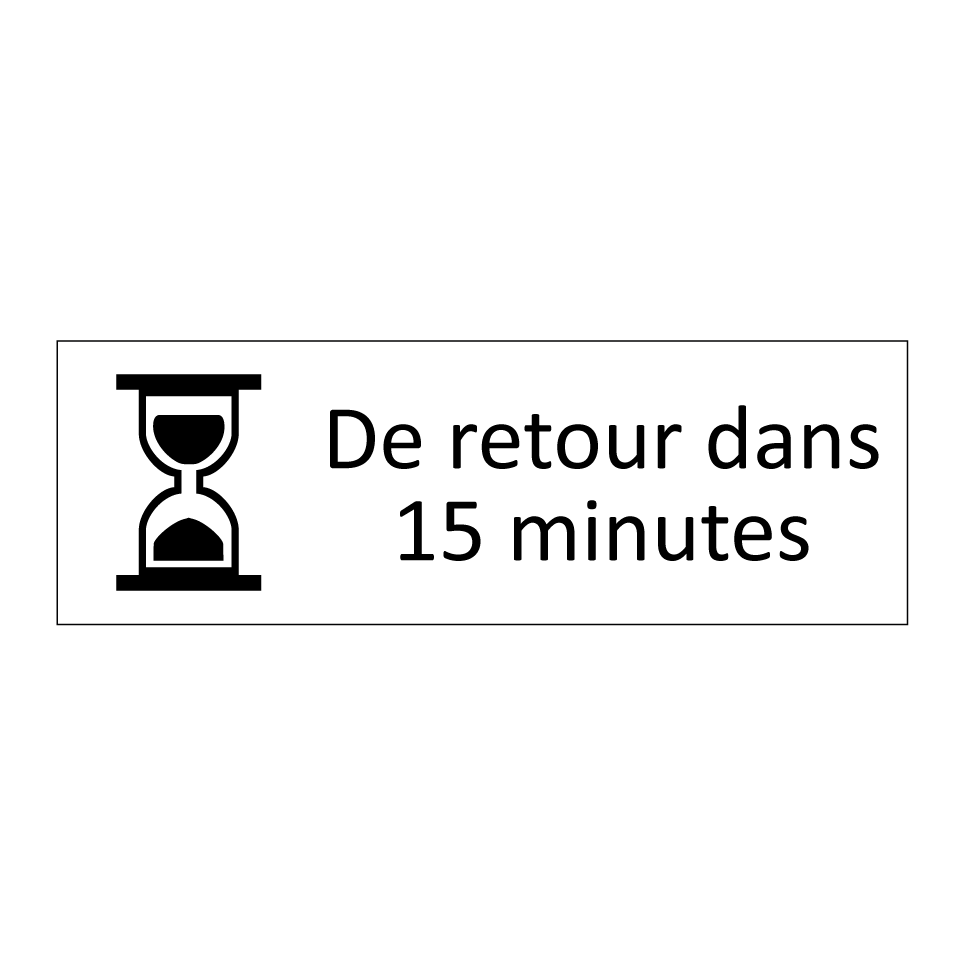 Panneau d'information avec le texte De retour dans 15 minutes et une symbolique claire pour une meilleure visibilité.