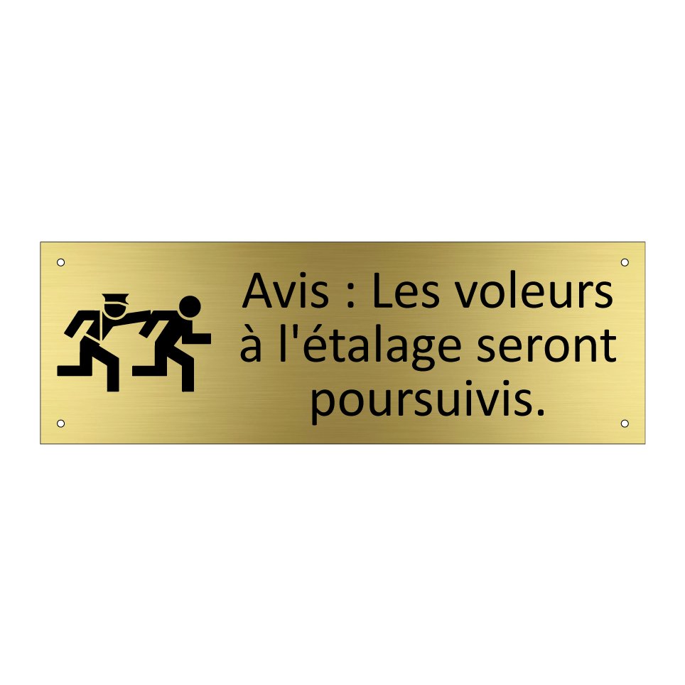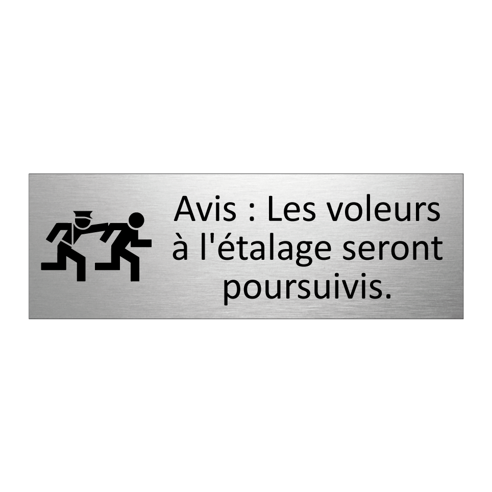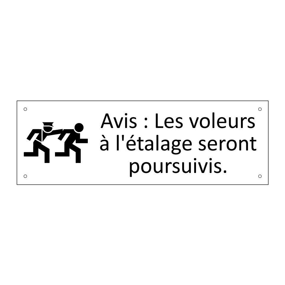 Panneau d'information avec le texte Avis : Les voleurs à l'étalage seront poursuivis. et une symbolique claire pour une meilleure visibilité.