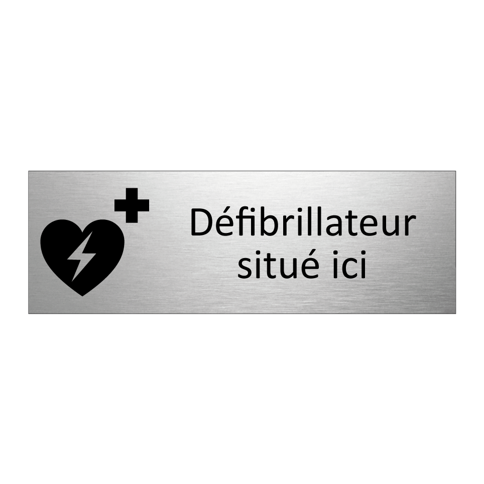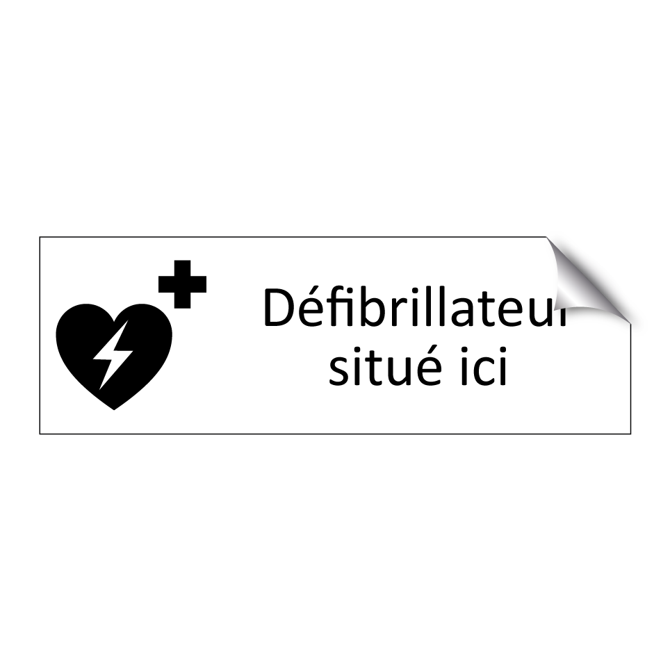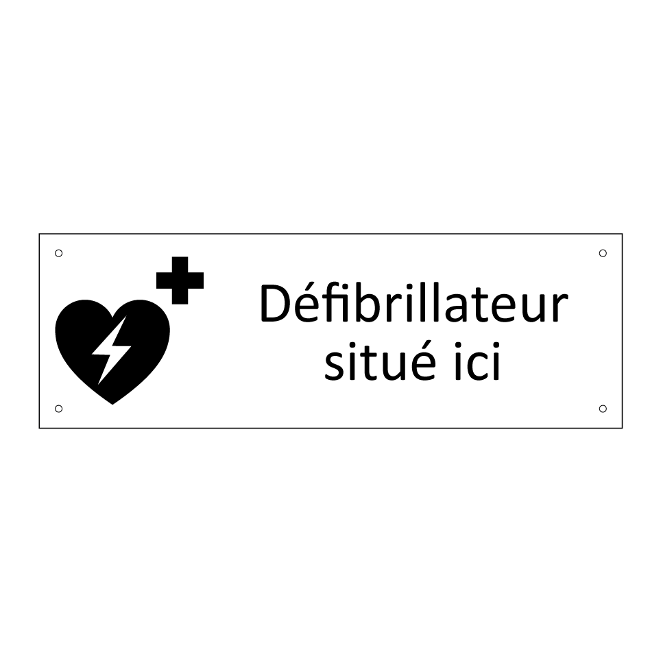 Panneau d'information avec le texte Défibrillateur situé ici et une symbolique claire pour une meilleure visibilité.