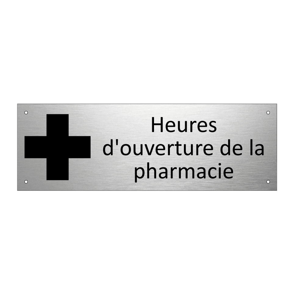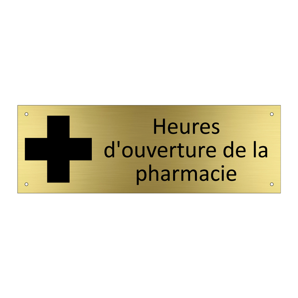 Panneau d'information avec le texte Heures d'ouverture de la pharmacie et une symbolique claire pour une meilleure visibilité.