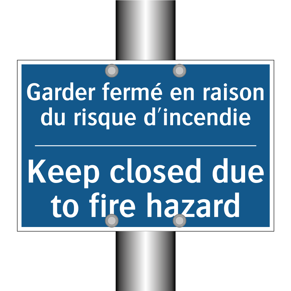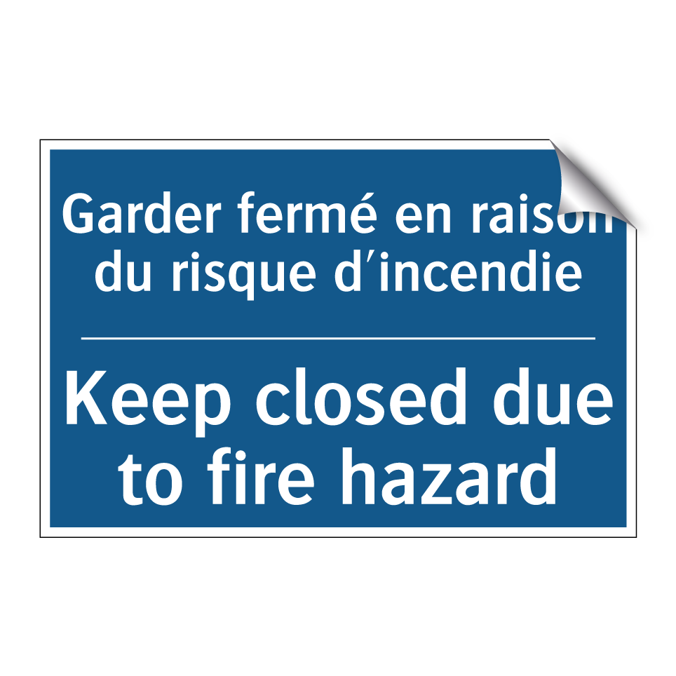 Panneau d'obligation bilingue avec texte en français : "Garder fermé en raison du risque d'incendie", et en anglais : "Keep closed due to fire hazard"