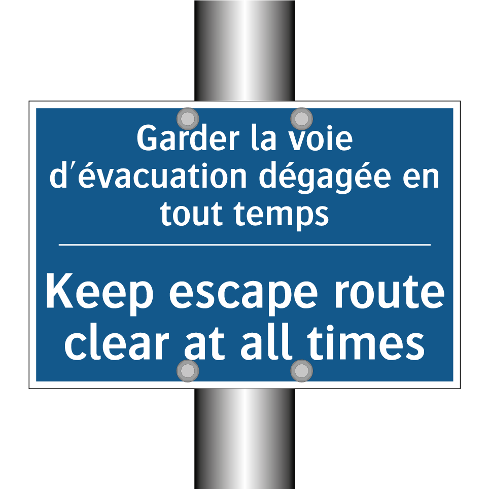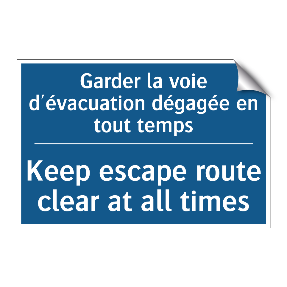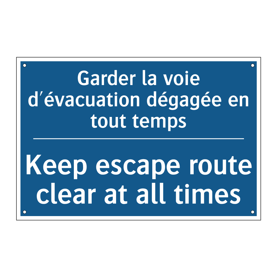 Panneau d'obligation bilingue avec texte en français : "Garder la voie d'évacuation dégagée en tout temps", et en anglais : "Keep escape route clear at all times"