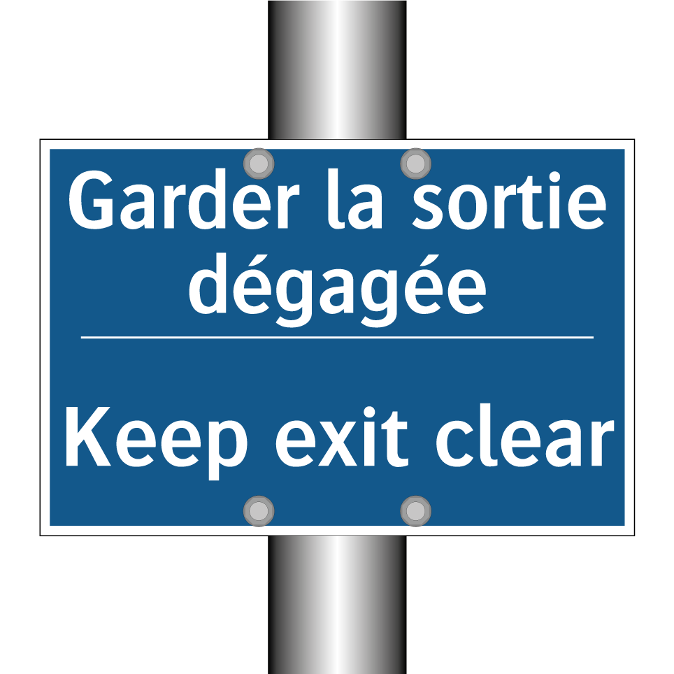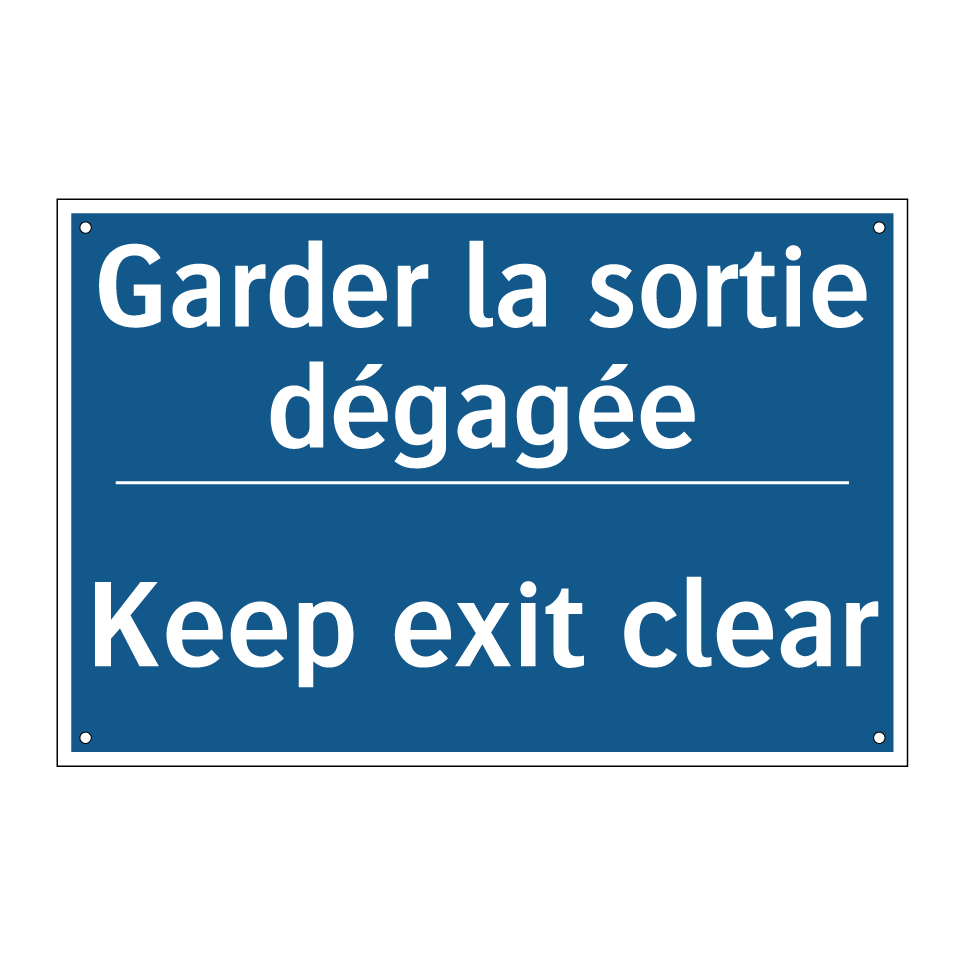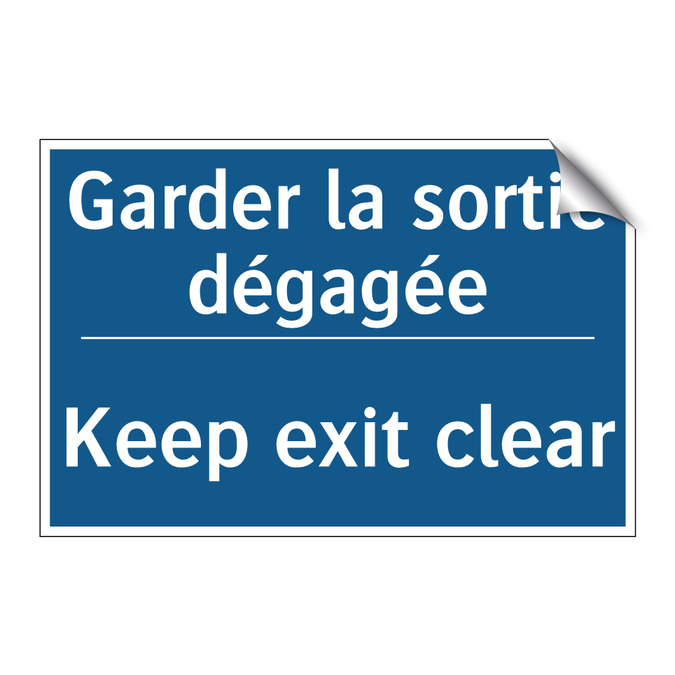Panneau d'obligation bilingue avec texte en français : "Garder la sortie dégagée", et en anglais : "Keep exit clear"