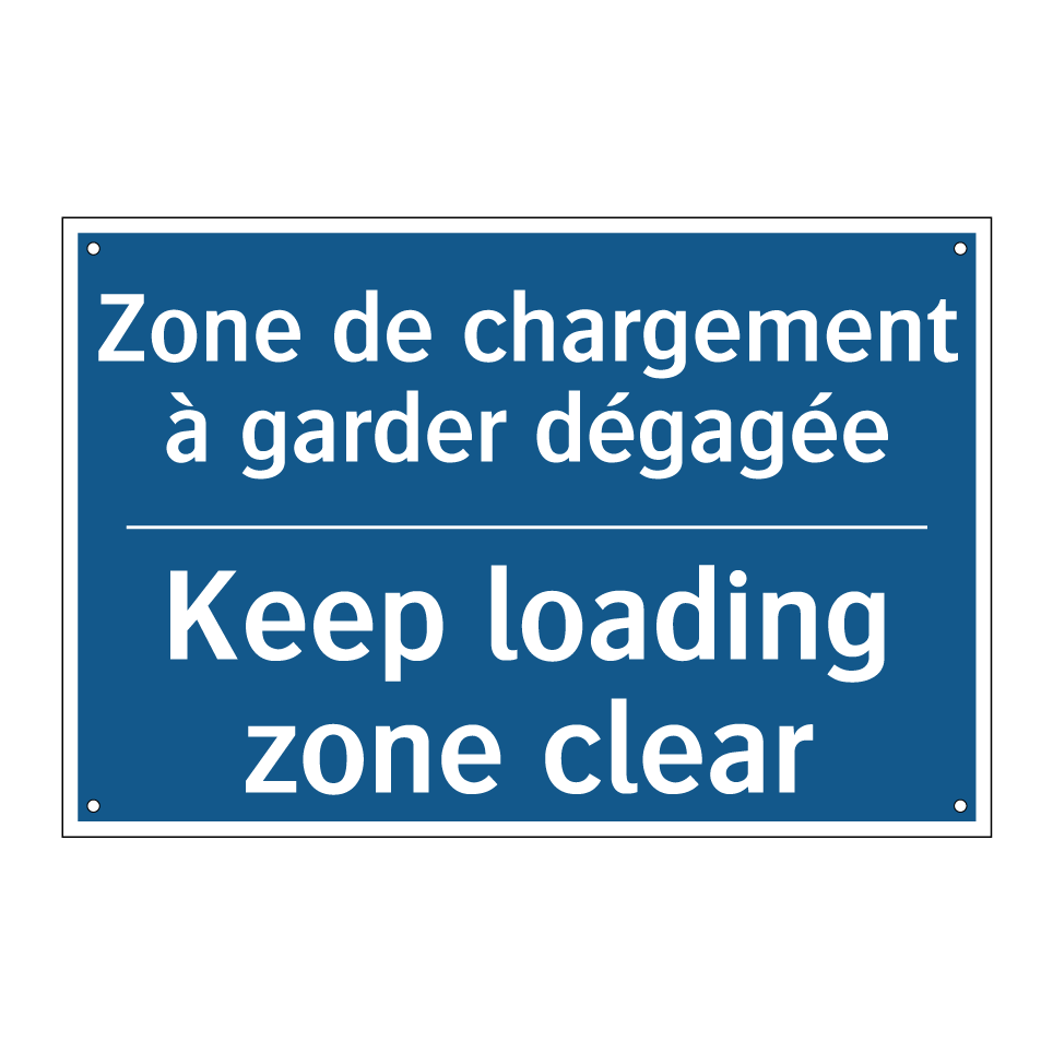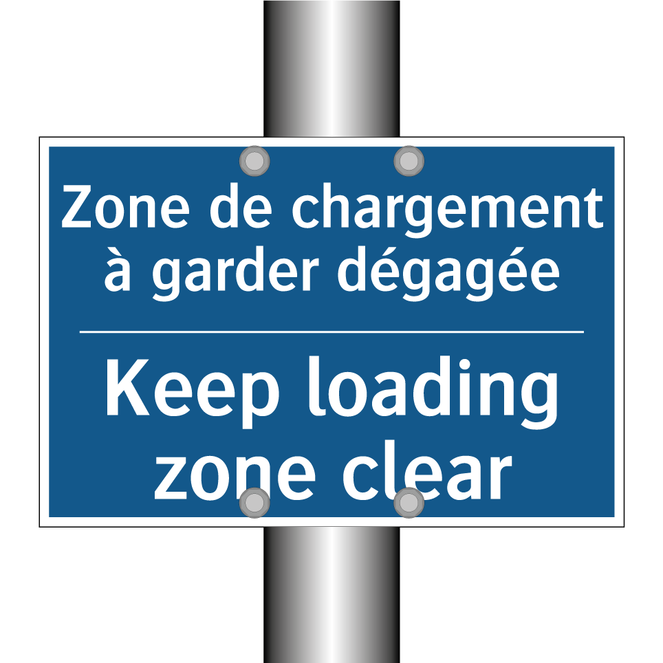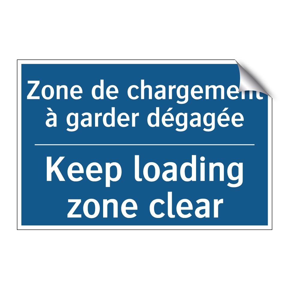 Panneau d'obligation bilingue avec texte en français : "Zone de chargement à garder dégagée", et en anglais : "Keep loading zone clear"