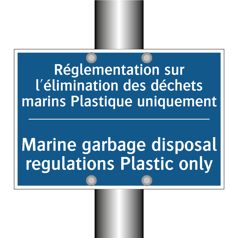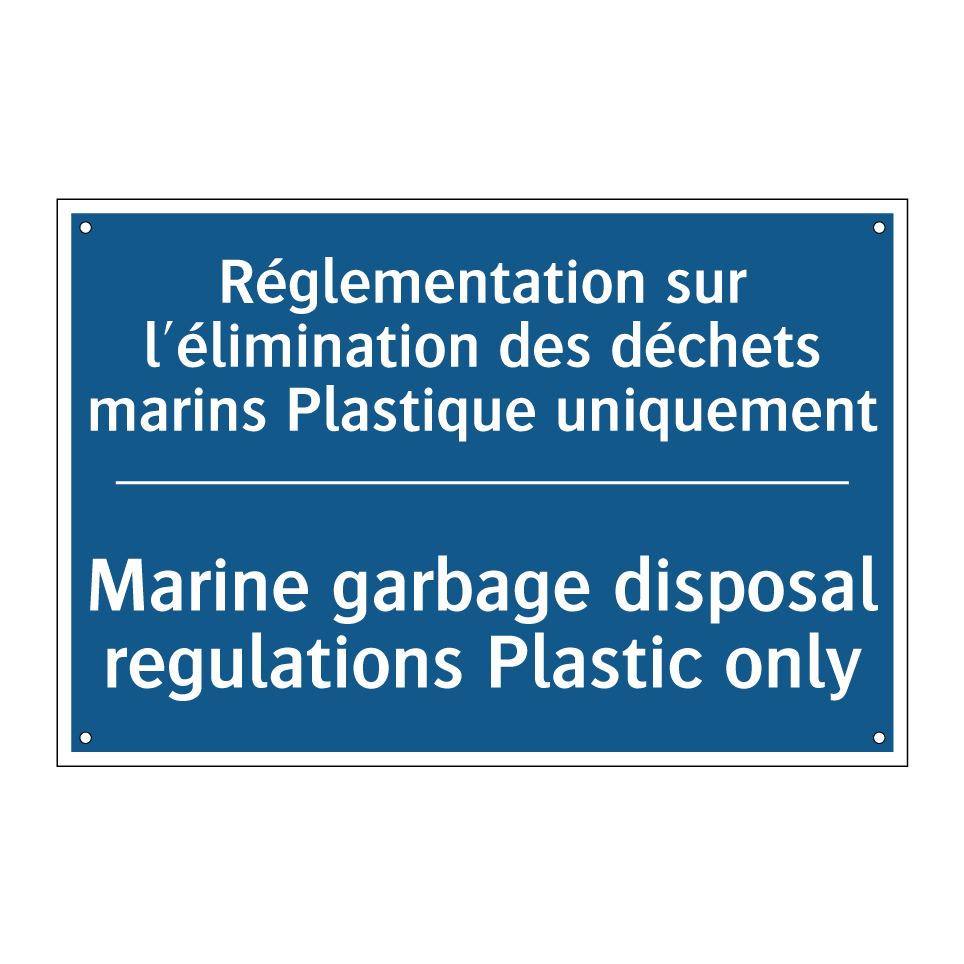 Panneau d'obligation bilingue avec texte en français : "Réglementation sur l'élimination des déchets marins Plastique uniquement", et en anglais : "Marine garbage disposal regulations Plastic only"