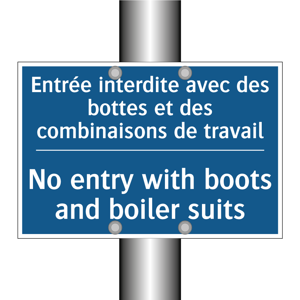 Panneau d'obligation bilingue avec texte en français : "Entrée interdite avec des bottes et des combinaisons de travail", et en anglais : "No entry with boots and boiler suits"